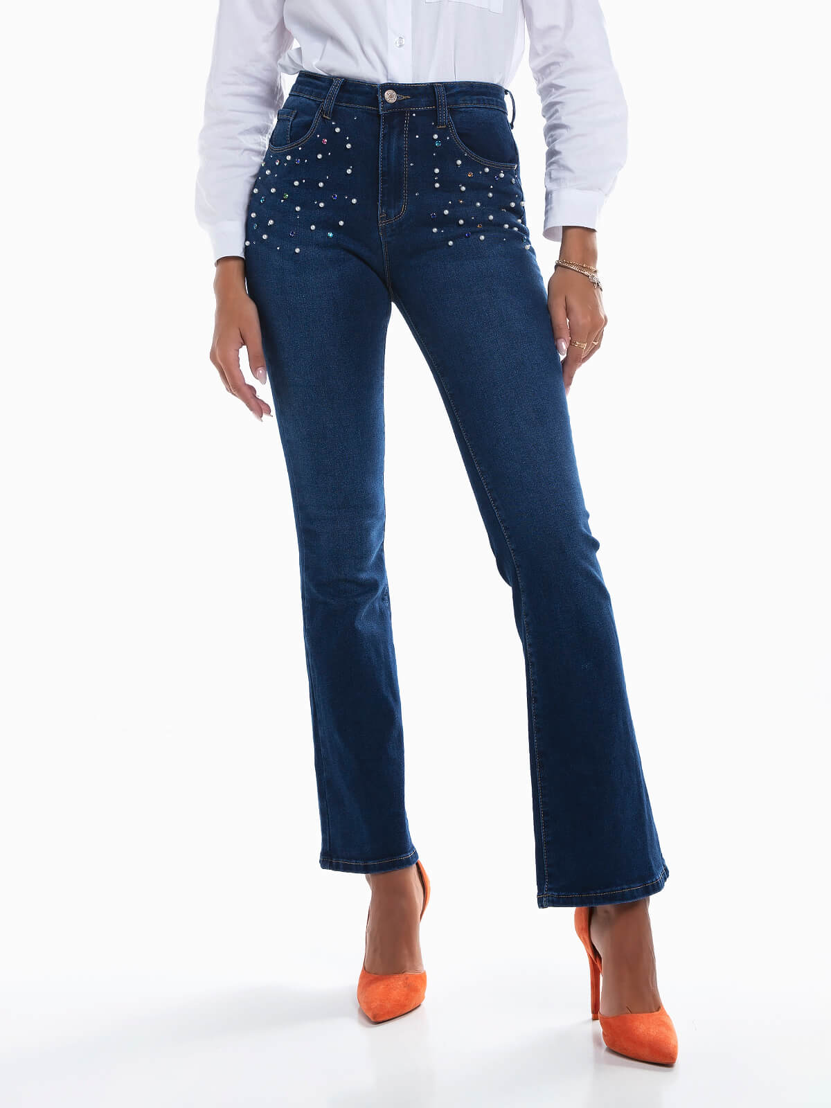 Jeans flare com efeito push-up e pérolas aplicadas. Calças ganga cintura alta com lavagem azul escuro. 5 bolsos. Aperto fecho éclair e botão.