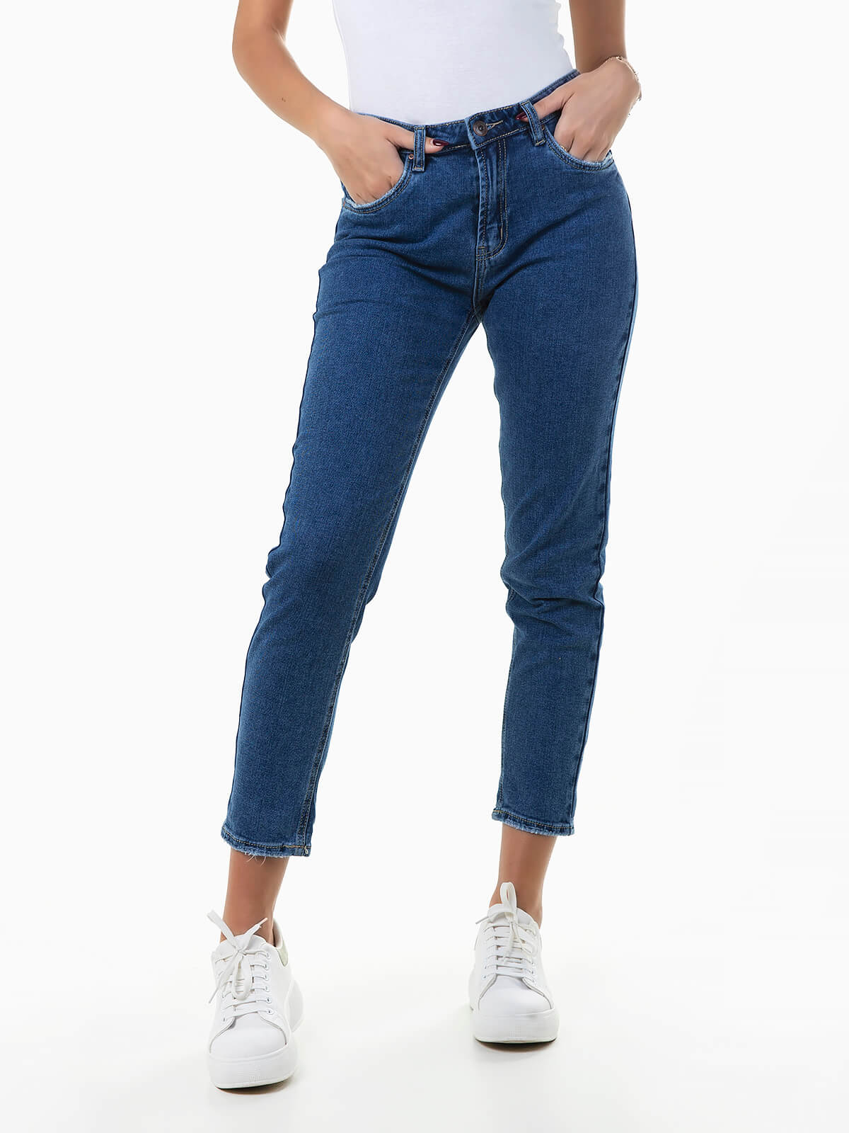 Jeans mom fit de cintura subida para senhora. Calças ganga elástica com lavagem azul escuro. 5 bolsos. Aperto fecho éclair e botão.