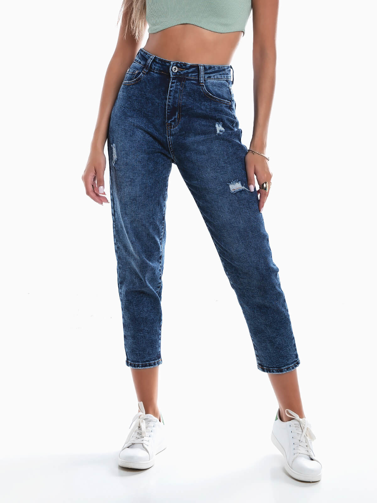 Jeans mom fit com pequenos rasgos. Calças ganga cintura alta para senhora com lavagem azul escuro manchado. 5 bolsos. Aperto de fecho éclair e botão.