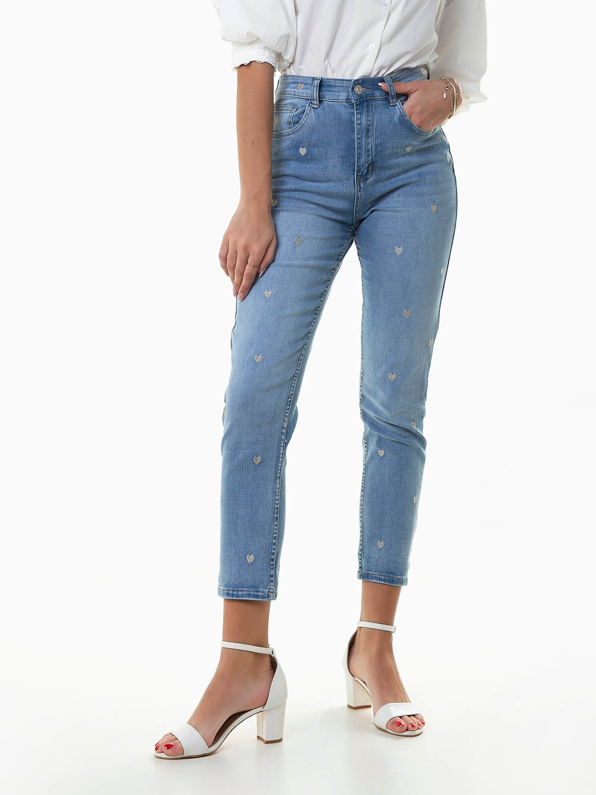 Jeans mom fit com corações bordados em contraste. Calças ganga elástica de cintura alta com 5 bolsos. Lavagem azul claro. Aperto fecho éclair e botão.