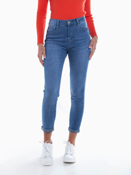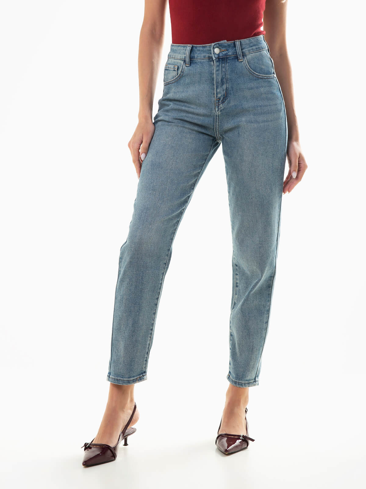 Calças ganga mom tapered fit com lavagem azul claro para senhora. Jeans de cintura alta com 5 bolsos. Aperto fecho éclair e botão.