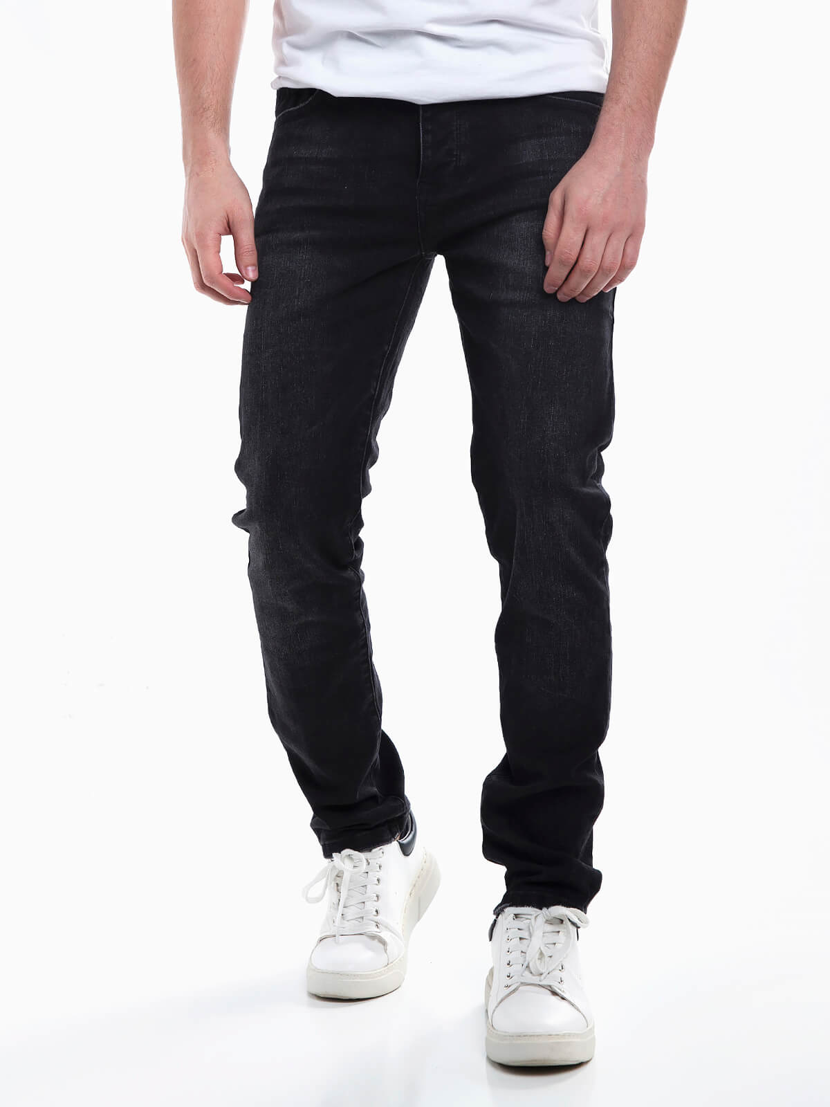 Jeans pretas regular fit para homem. Calças ganga elásticas com 5 bolsos. Aperto frontal botões.