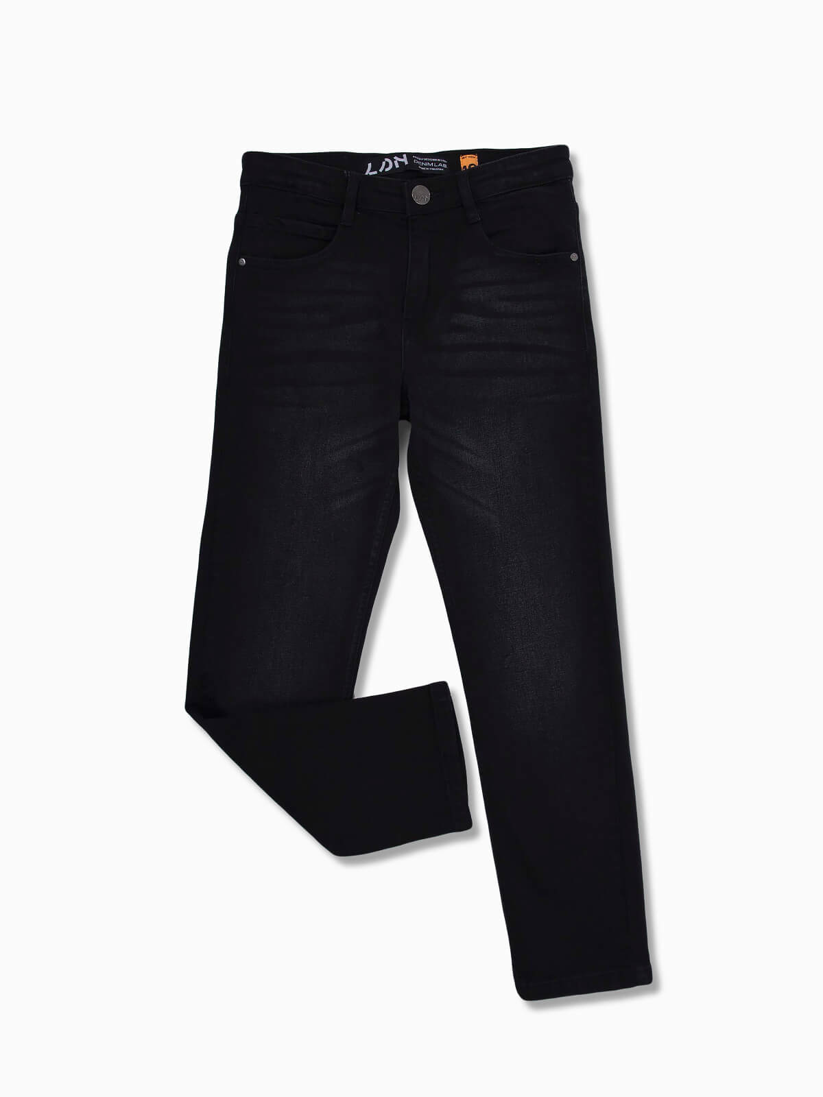Jeans pretas slim comfort fit para menino. Calças ganga com ajustador no interior. 5 bolsos. Aperto de fecho éclair e botão.