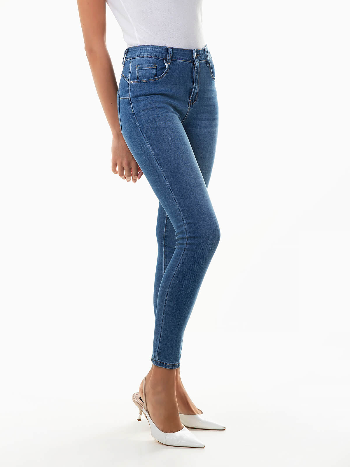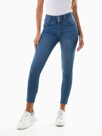 Jeans efeito push-up de cintura alta para senhora. Calças ganga elásticas com lavagem azul escuro. 5 bolsos. Aperto fecho éclair e botão.