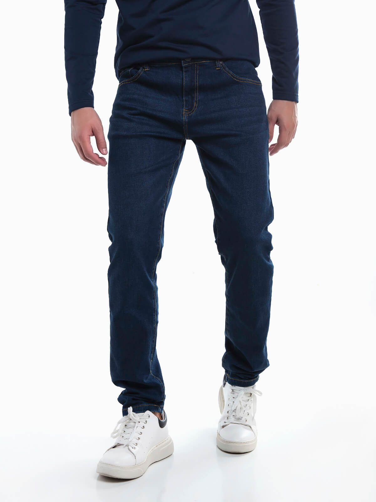 Jeans regular fit com lavagem azul escuro para homem. Calças ganga elásticas com 5 bolsos. Aperto fecho éclair e botão.