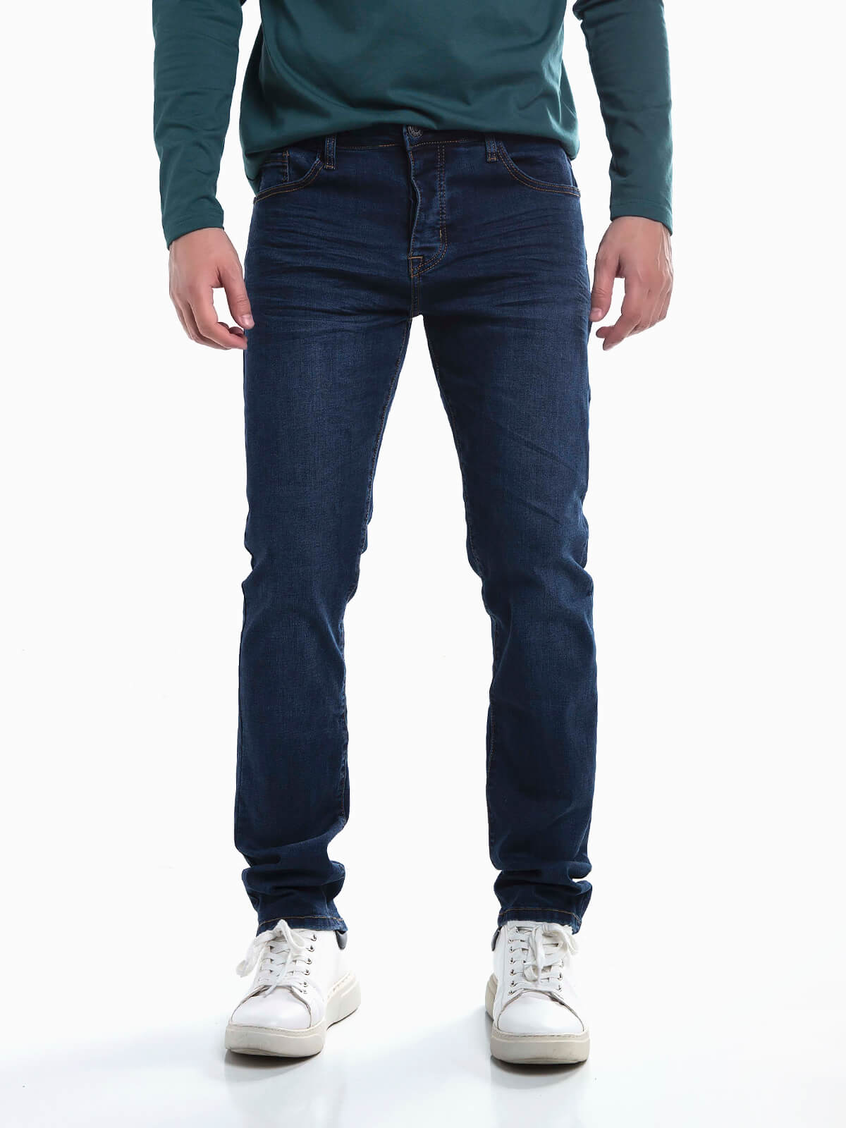 Calças ganga regular fit com lavagem azul escuro para homem. Jeans elásticas com 5 bolsos. Aperto fecho éclair e botão.
