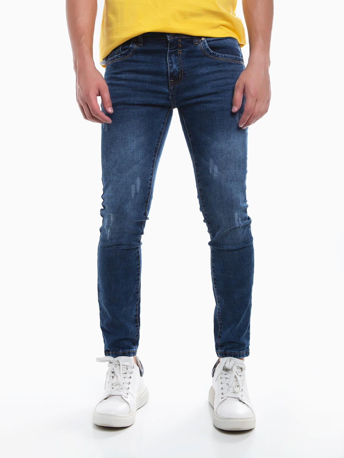 Jeans skinny fit com pormenores de rasgos para homem. Calças ganga elásticas. 5 bolsos. Aperto de fecho éclair e botão.