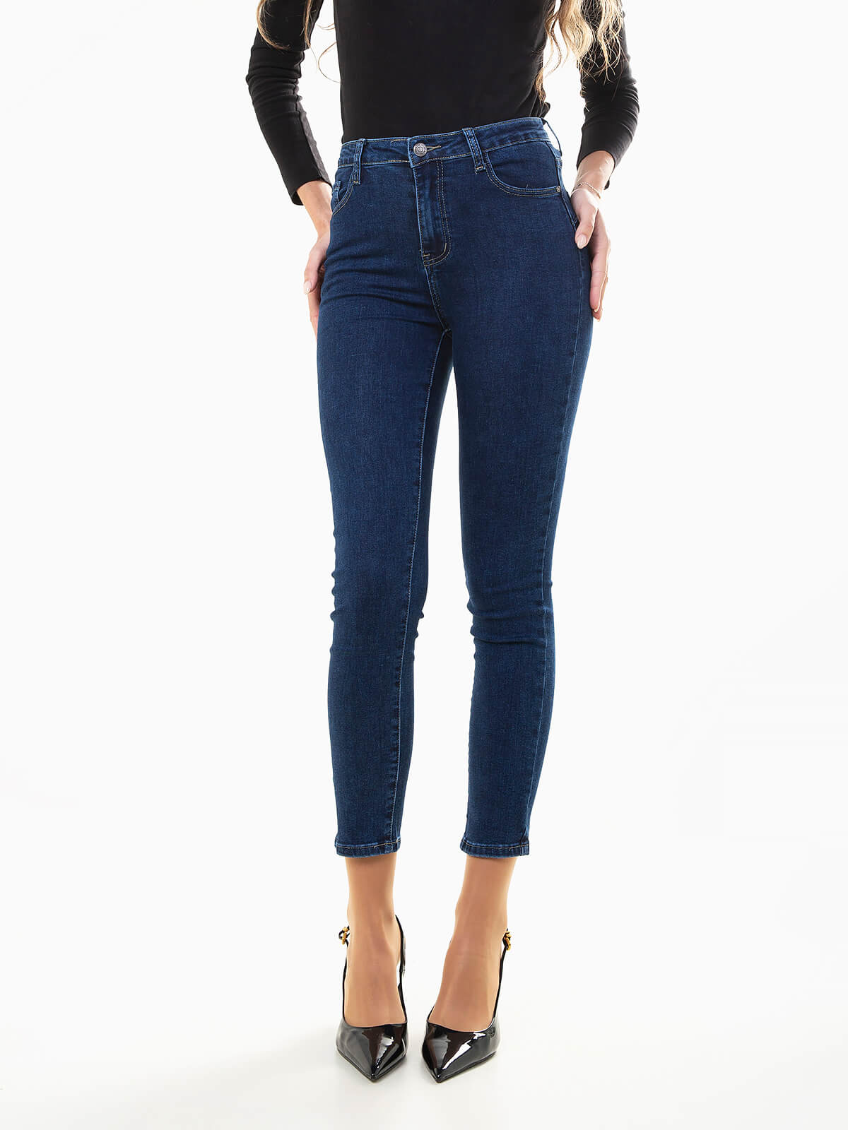Jeans skinny push-up de cintura alta com lavagem azul escuro. Modelo ajustado e confortável com 5 bolsos. Combina com camisola justa ou blazer e sapatos de salto para um look feminino e atual.