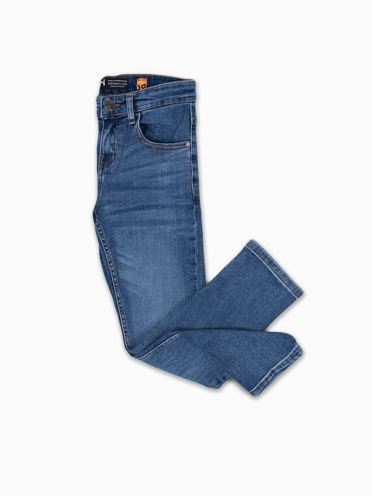 Jeans slim confort fit para menino. Calças de ganga elásticas com lavagem azul escuro e ajustador no interior. 5 bolsos. Aperto de fecho éclair e botão.