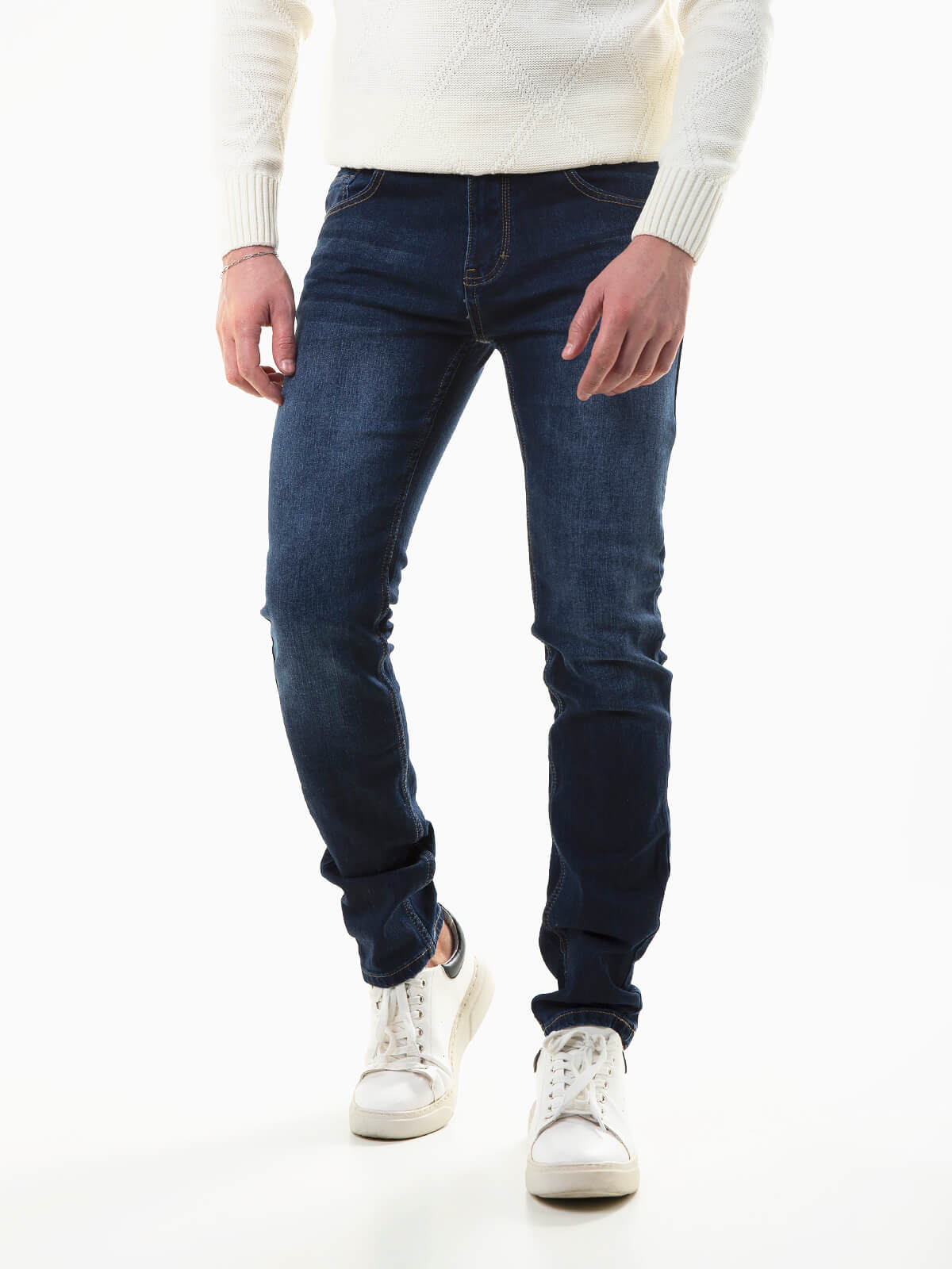 Jeans slim fit com lavagem azul escuro. Calças ganga para homem com 5 bolsos. Aperto fecho éclair e botão.