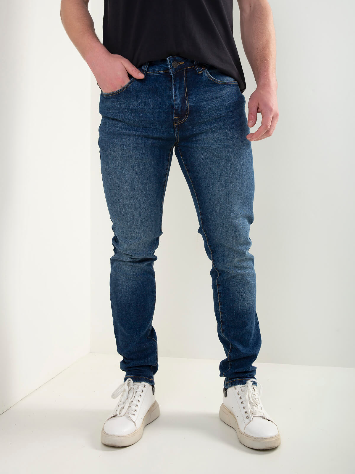 Calças de ganga slim fit em lavagem azul, com corte ajustado que acompanha a silhueta de forma confortável. Modelo de 5 bolsos com fecho éclair e botão, ideal para looks do dia a dia. Com ligeira elasticidade, garante liberdade de movimentos e um ajuste prático.