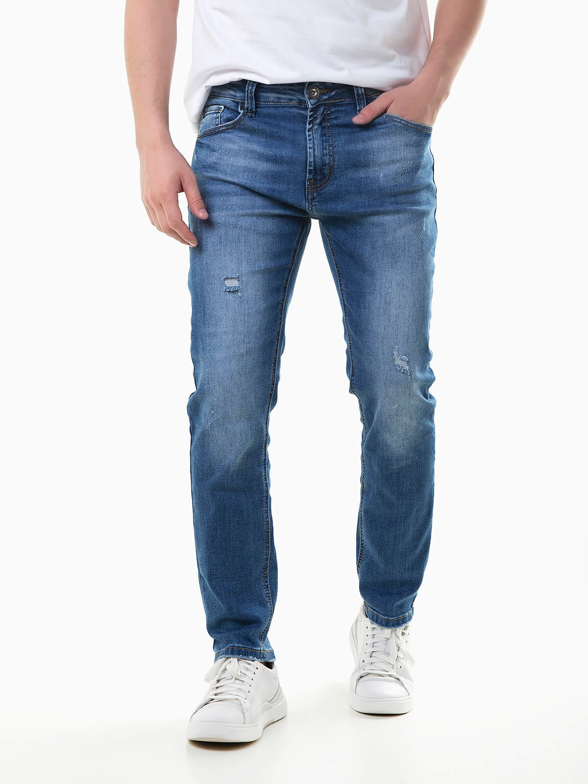Jeans slim fit com pequenos rasgos para homem. Calças ganga elásticas com 5 bolsos. Aperto fecho éclair e botão.