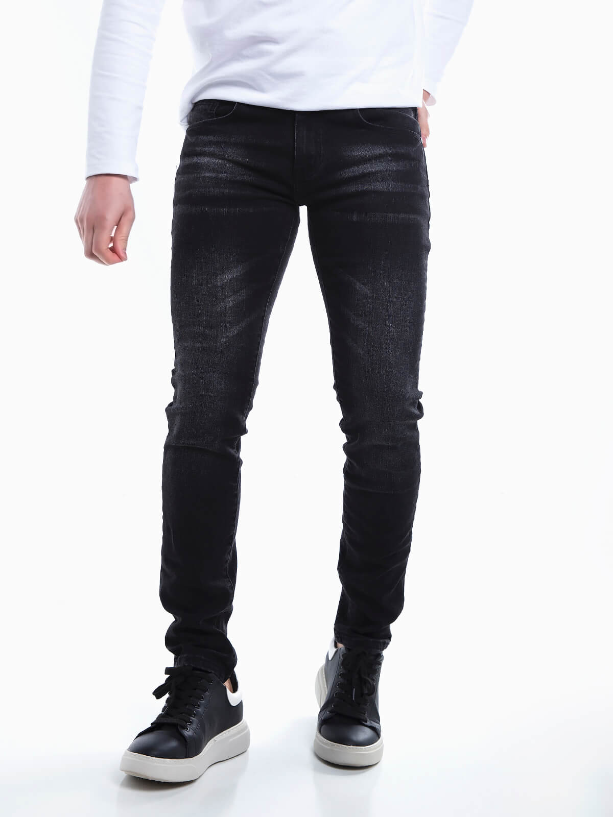 Calças de ganga slim fit pretas com manchas. Jeans com elastano para maior conforto. 5 bolsos. Aperto de fecho éclair e botão.