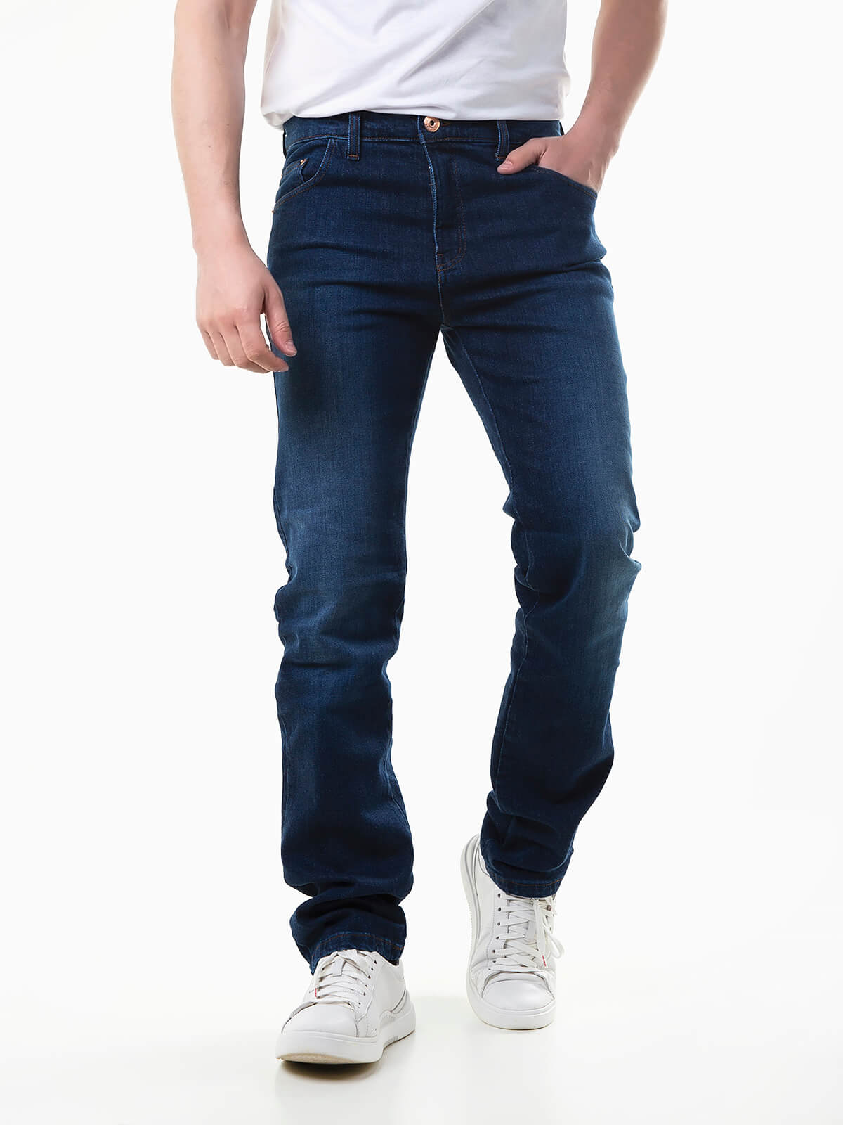 Jeans straight fit com lavagem azul escuro. Calças ganga com 5 bolsos. Aperto fecho zíper e botão.
