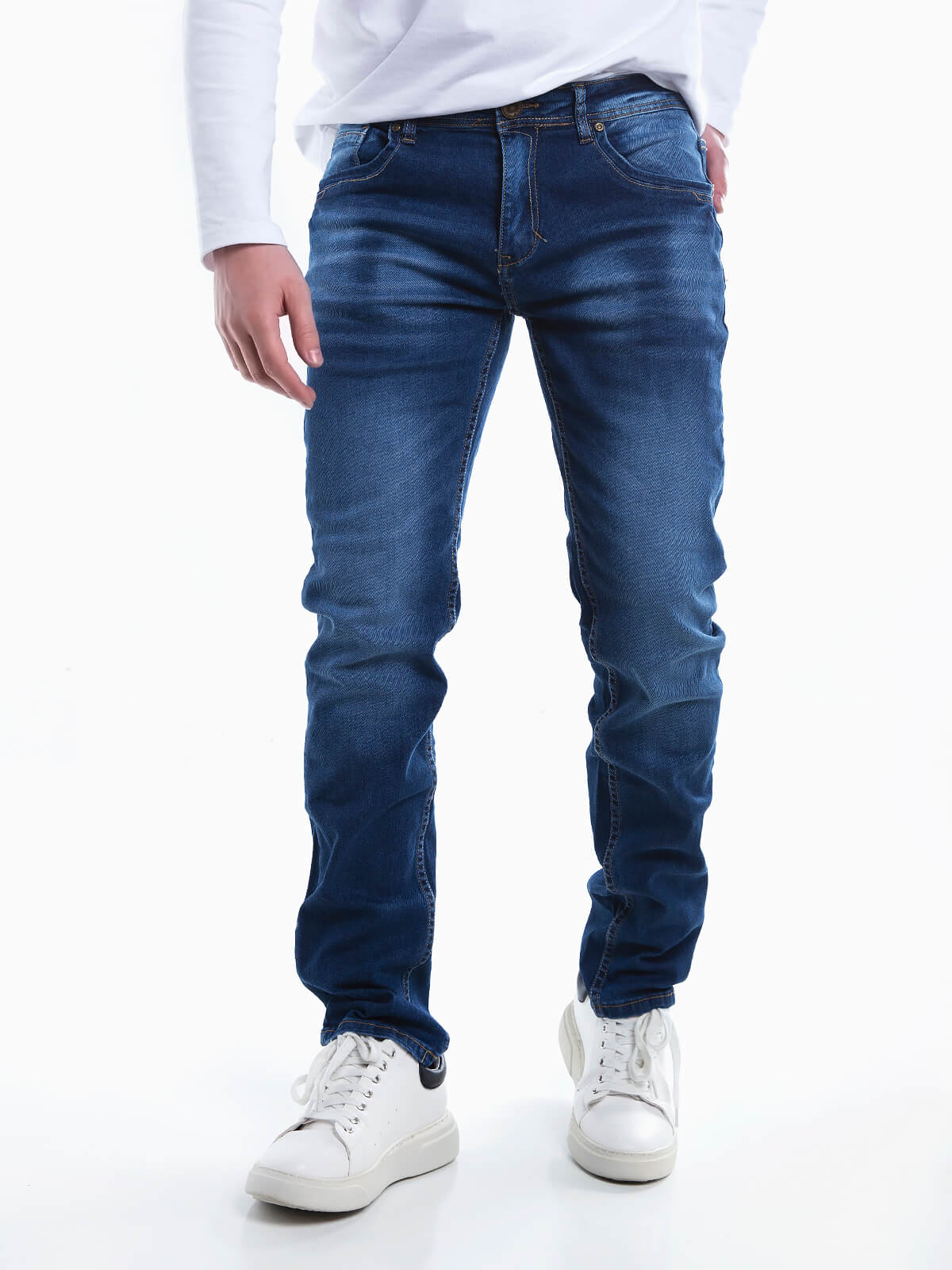 Calças de ganga straight fit de lavagem azul escuro para homem. Jeans elásticas com pormenores manchados. 5 bolsos. Aperto de fecho éclair e botão.