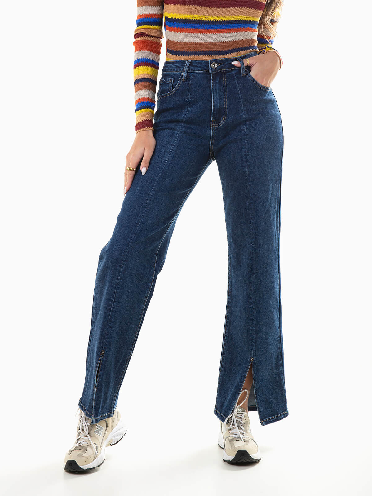 Jeans straight fit com lavagem azul escuro e aberturas na base. Calças ganga cintura alta com pinças. 5 bolsos. Aperto fecho éclair e botão.