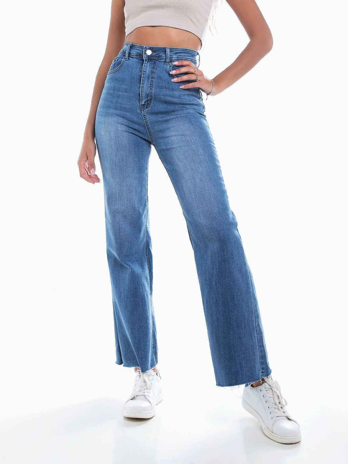 Jeans de perna reta com bainha desfiada para senhora. Calças ganga de cintura alta com 5 bolsos. Aperto de fecho éclair e botão.
