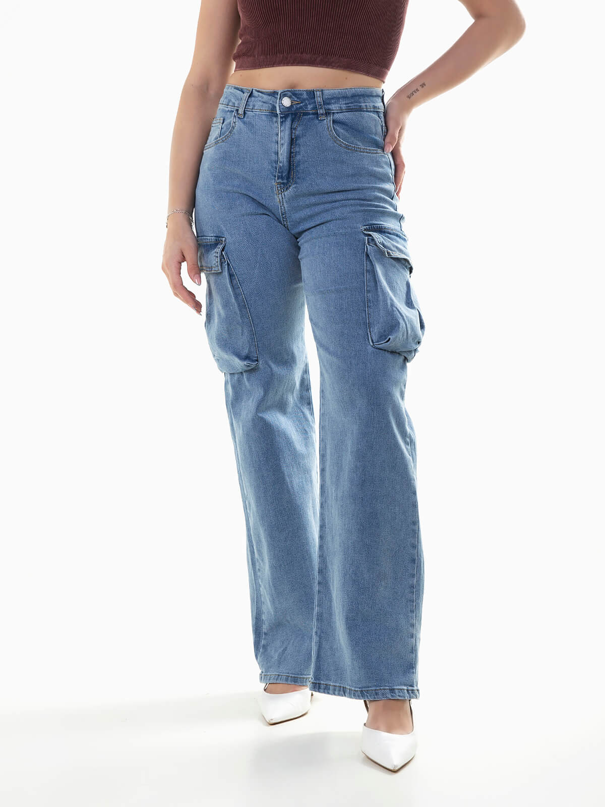 Jeans straight fit estilo cargo para senhora. Calças de ganga elástica de cintura alta com 7 bolsos. Aperto de fecho zíper e botão.