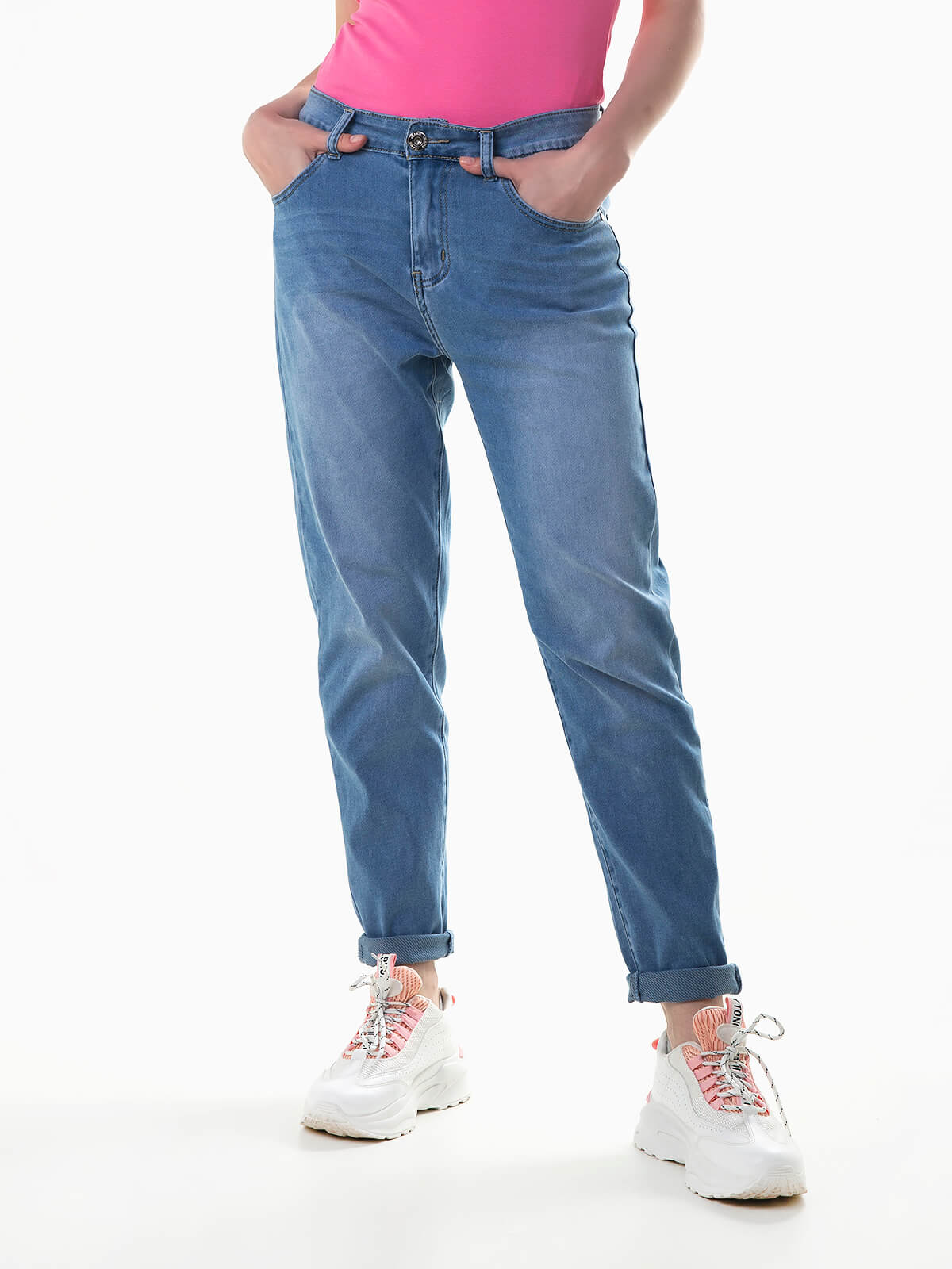 Jeans tapered mom fit para senhora. Calças ganga afuniladas com cintura média e lavagem azul claro. 5 bolsos. Aperto fecho éclair e botão.