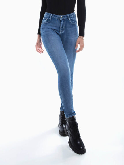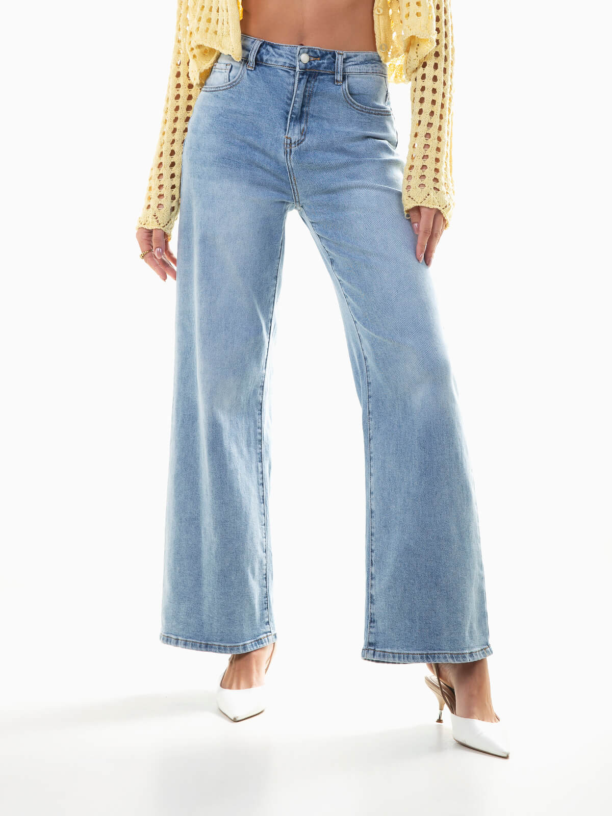 Jeans wide leg com lavagem azul claro para senhora. Calças ganga de cintura alta com 5 bolsos. Aperto de fecho éclair e botão.