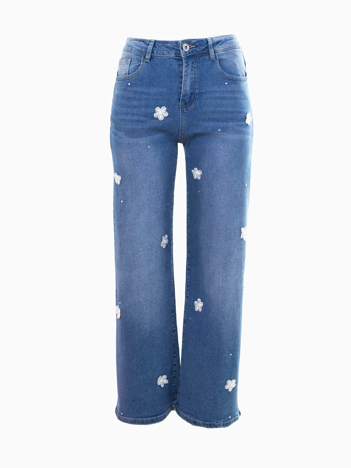 Jeans wide leg com aplicações florais