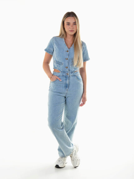 Jeans wide leg com flores bordadas em contraste. Calças ganga de cintura alta com 4 bolsos. Lavagem azul médio. Aperto de fecho éclair e botão.