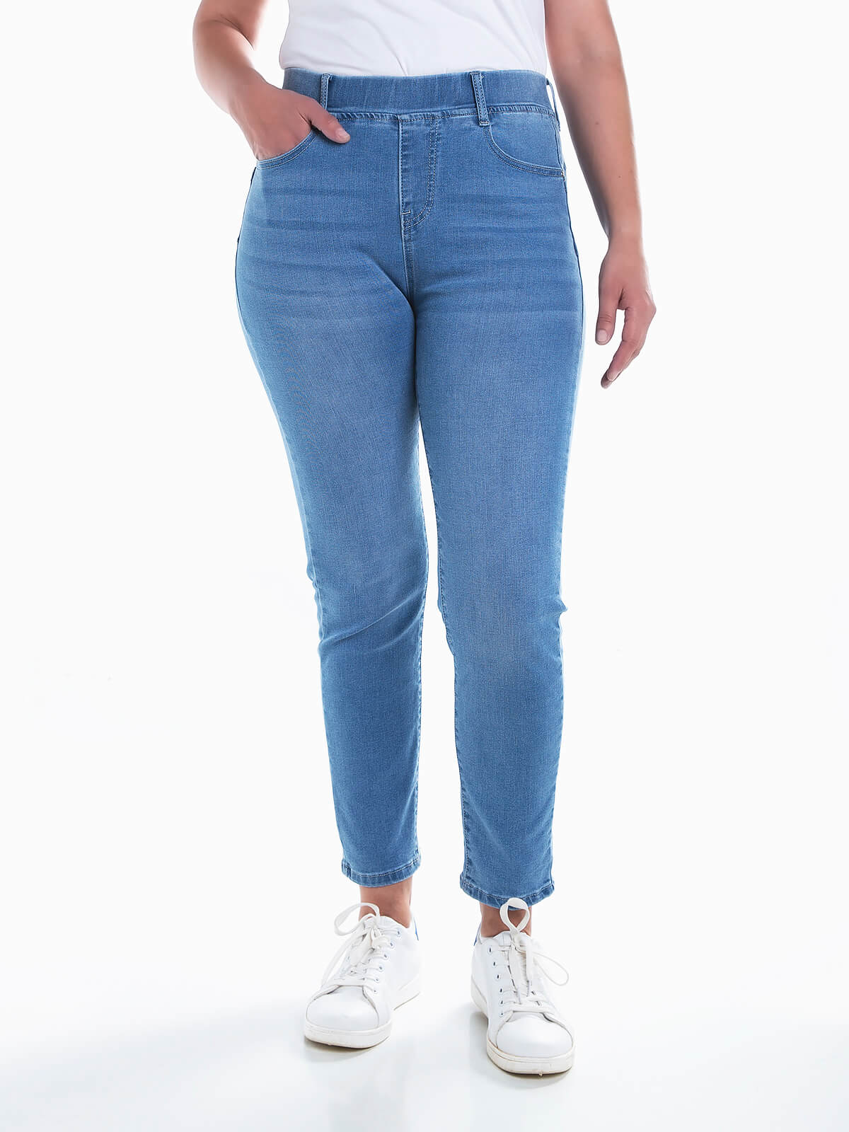 Jeggings com efeito push-up de lavagem azul claro para senhora. Jeggings elásticas de cintura alta com 5 bolsos.