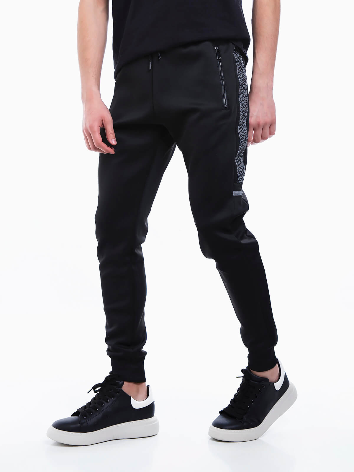 Joggers com bandas refletoras em contraste. Calças desportivas cintura elástica com cordão. Bolsos laterais com fecho. Punhos elásticos.