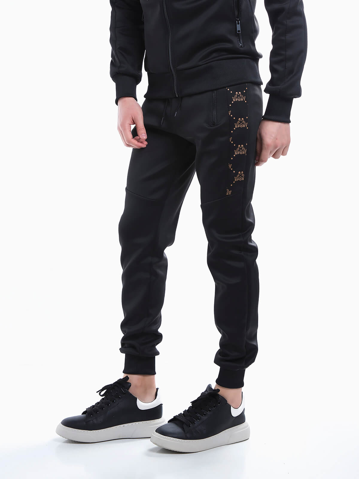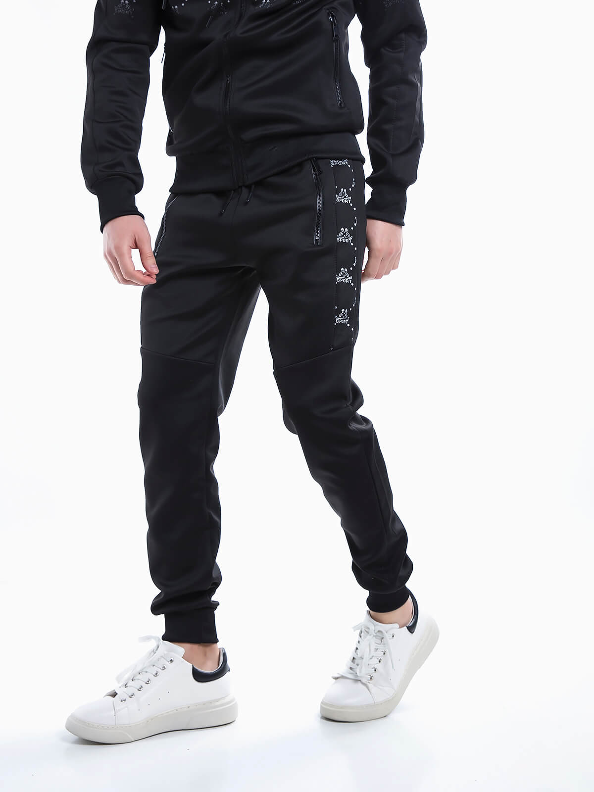 Joggers com símbolos estampados nas laterais. Cintura elástica com cordão. Bolsos com fecho. Punhos elásticos.