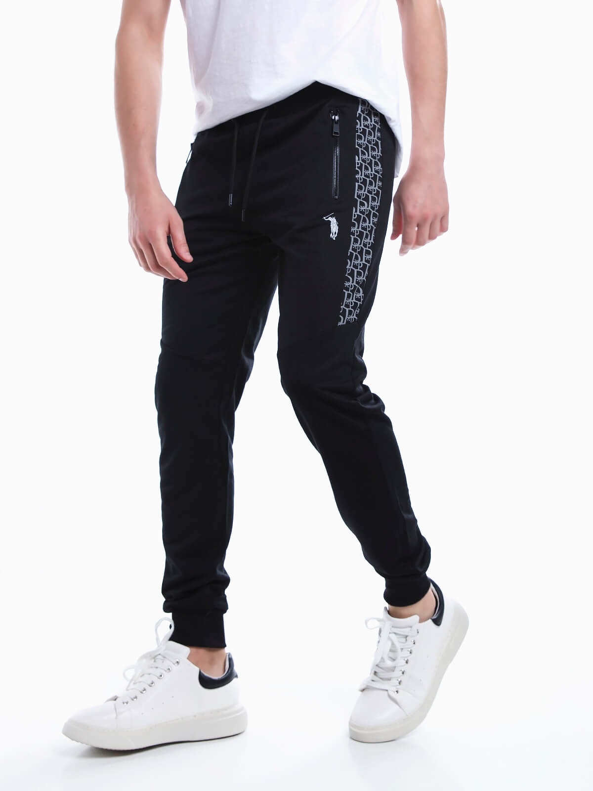 Joggers em felpa com símbolo bordado. Calças de fato de treino com bandas laterais estampadas. Cintura elástica com cordão. Bolsos laterais com fecho. Punhos elásticos.