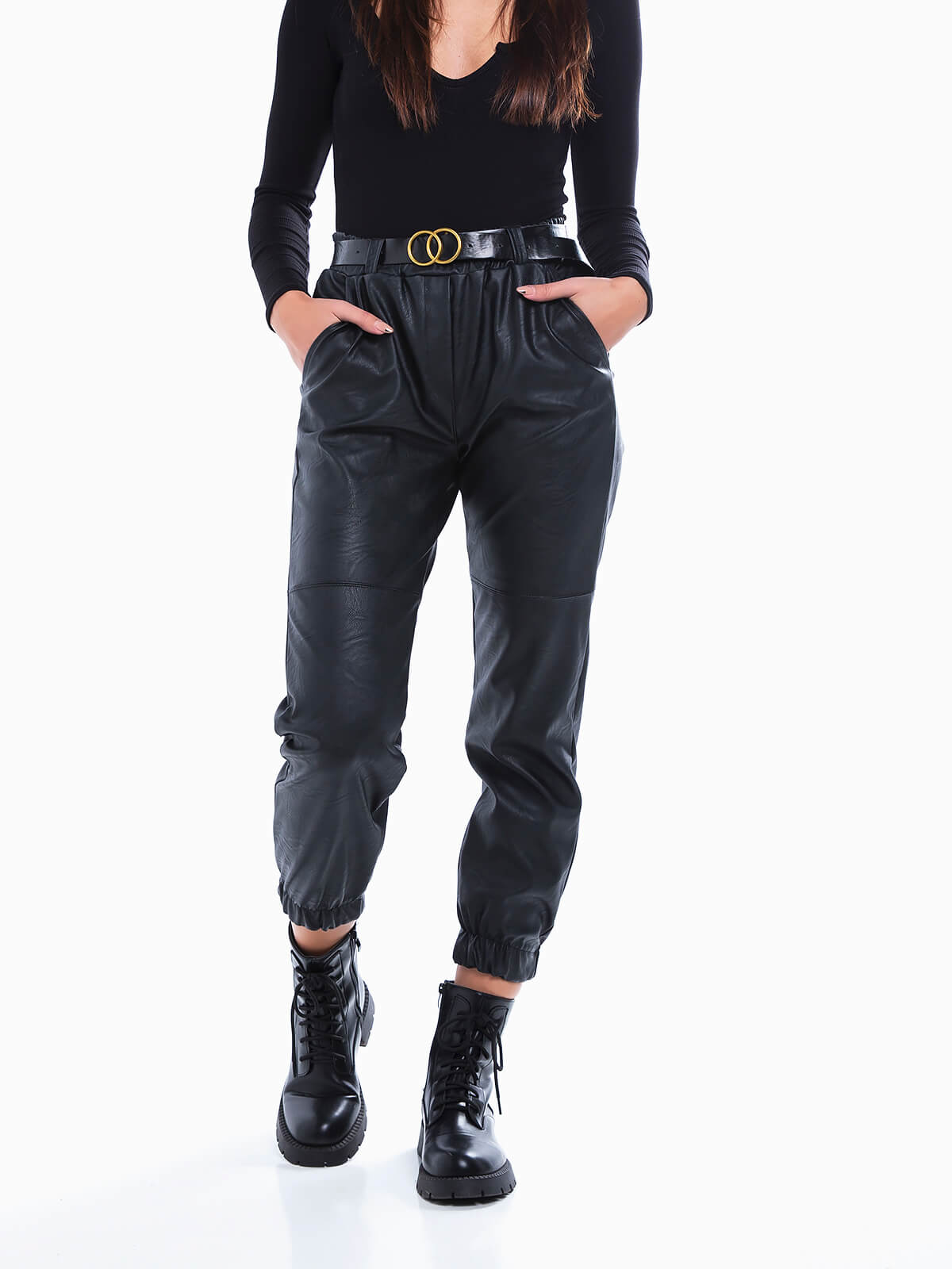 Joggers em pele sintética com cinto. Calças para senhora com bolsos faca laterais. Cintura alta. Extremidades elásticas.
