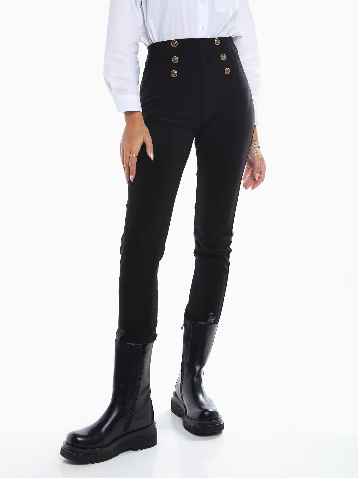 Leggings de cintura alta elástica com 6 botões dourados decorativos. Parte posterior com 2 bolsos.