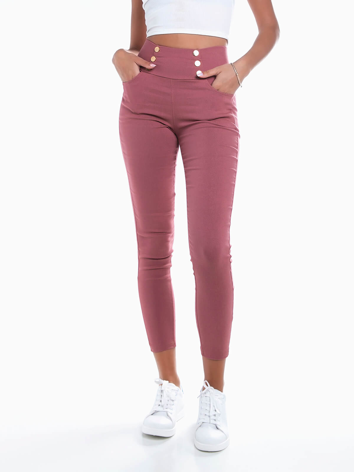 Leggings de cintura alta com 6 botões decorativos. Leggings elásticas com 2 bolsos à frente.