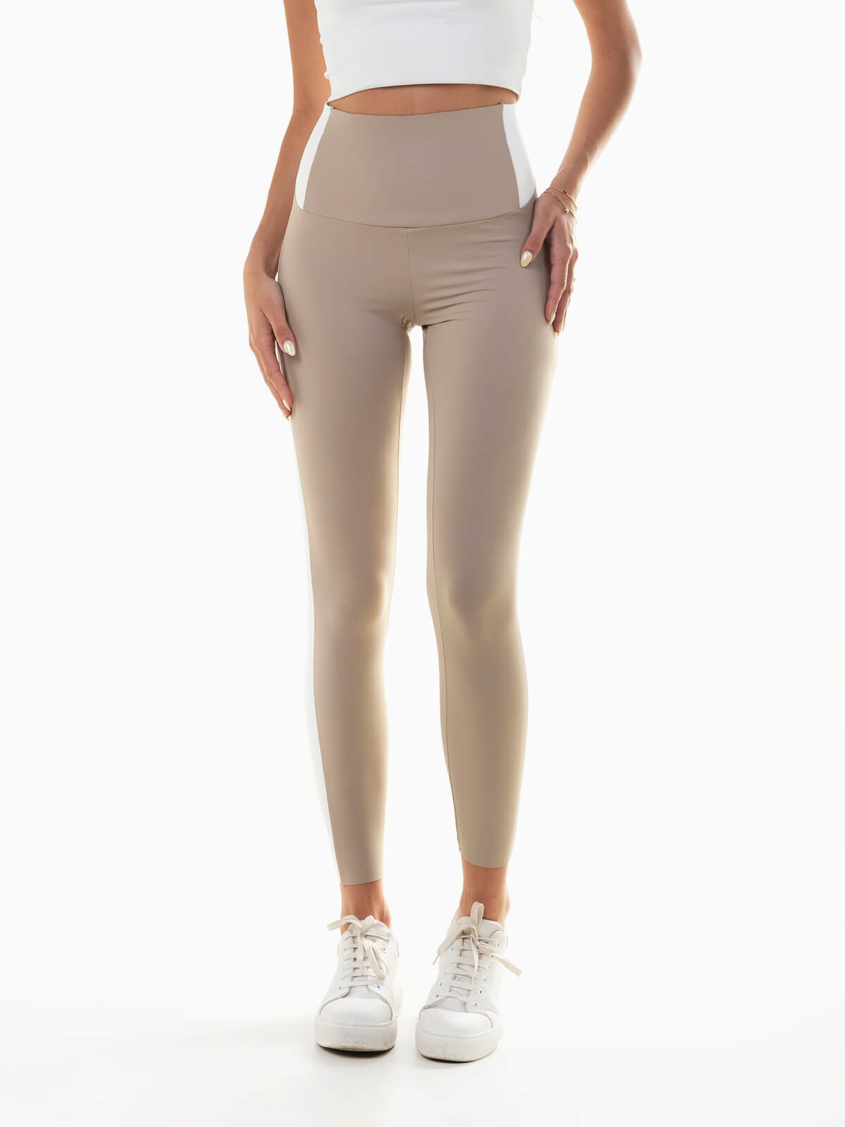 Leggings bicolor de cintura alta para senhora. Leggings fitness elásticas com cinto modelador.