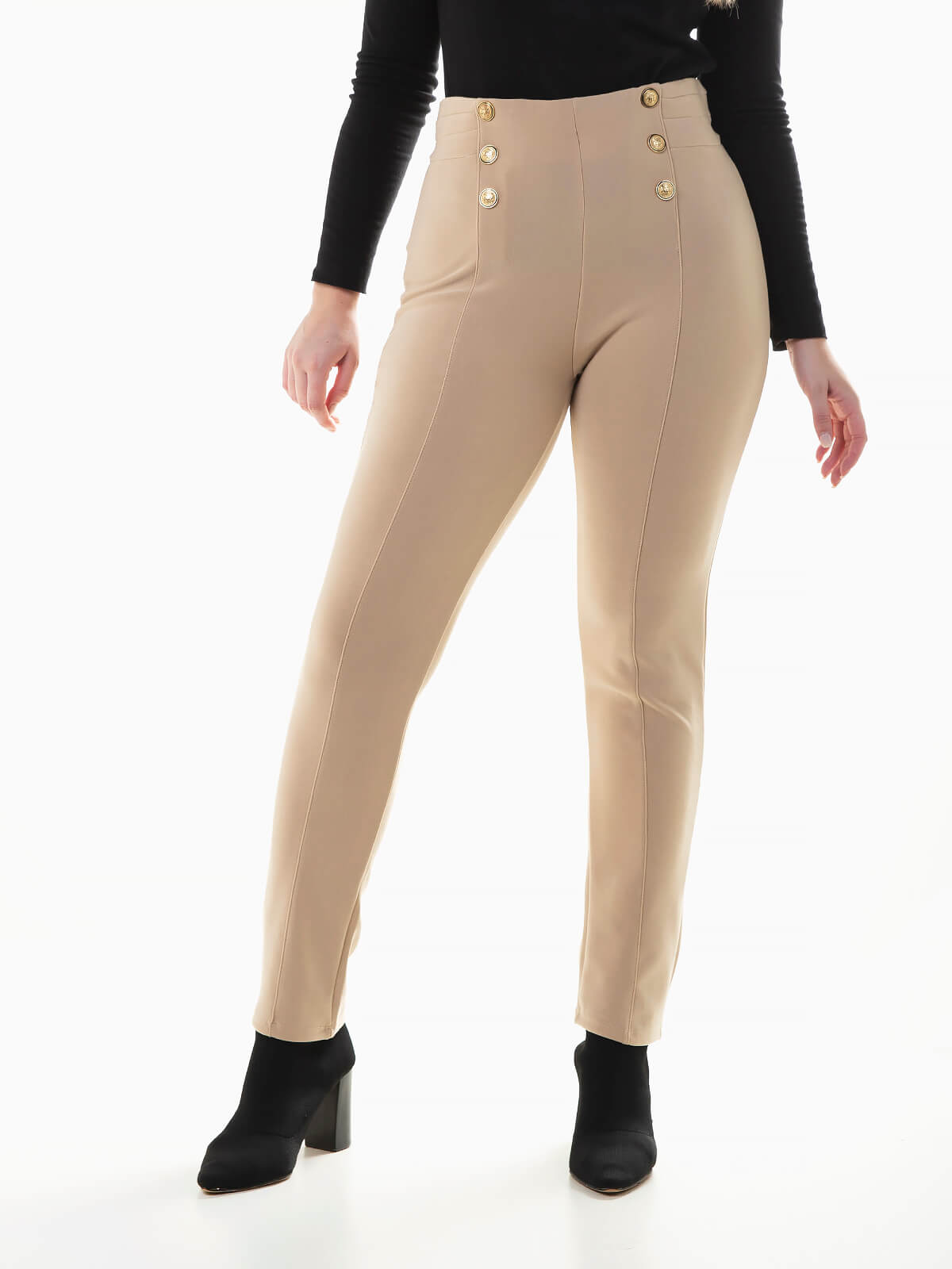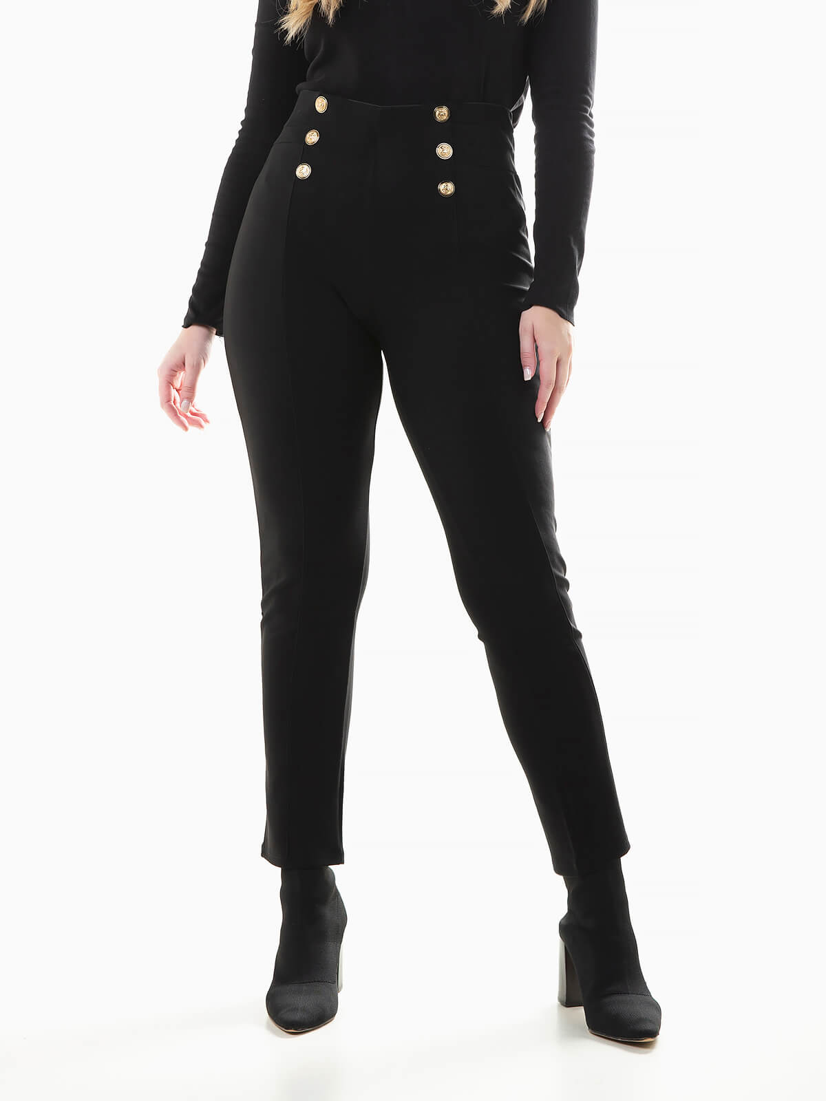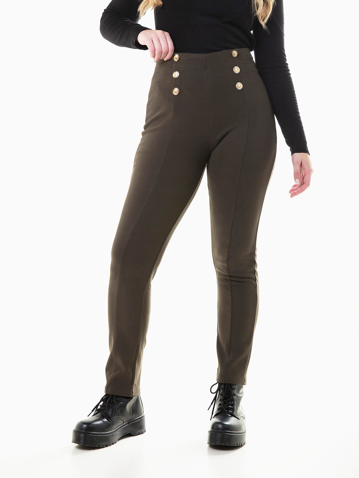 Leggings de cintura alta com botões dourados aplicados. Leggings elásticas com costura reforçada à frente e bolsos na parte posterior.