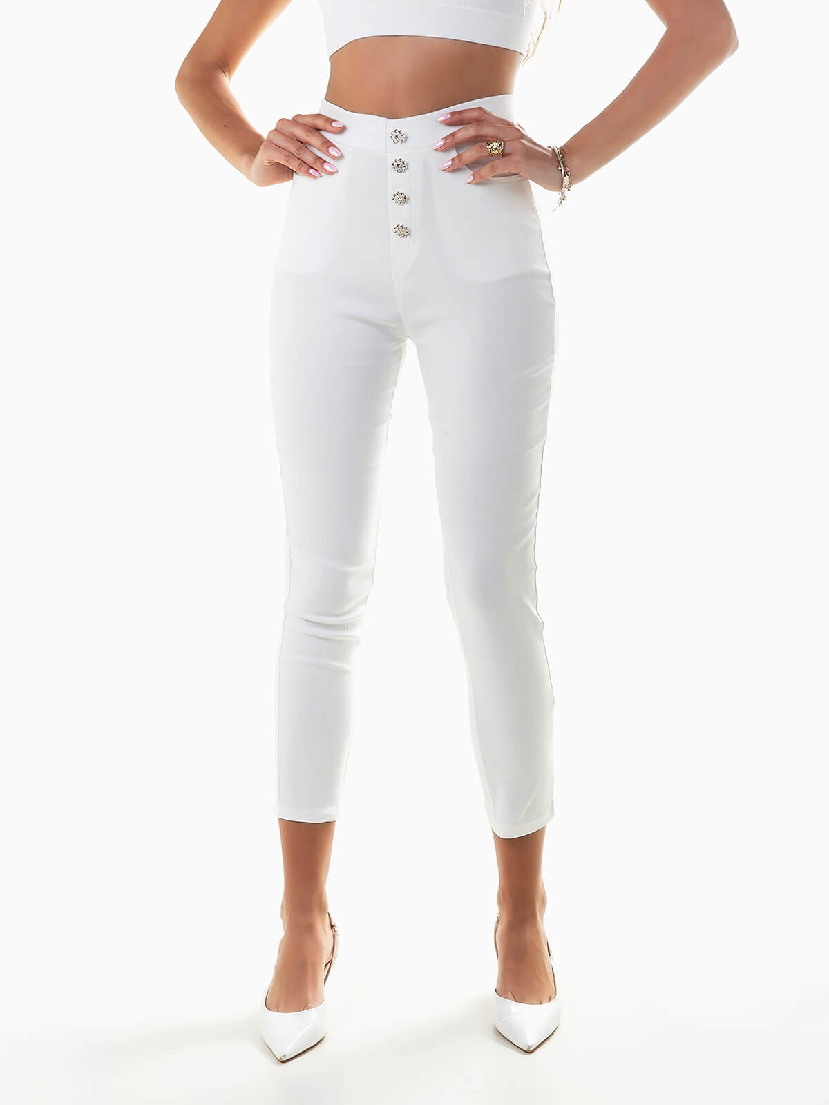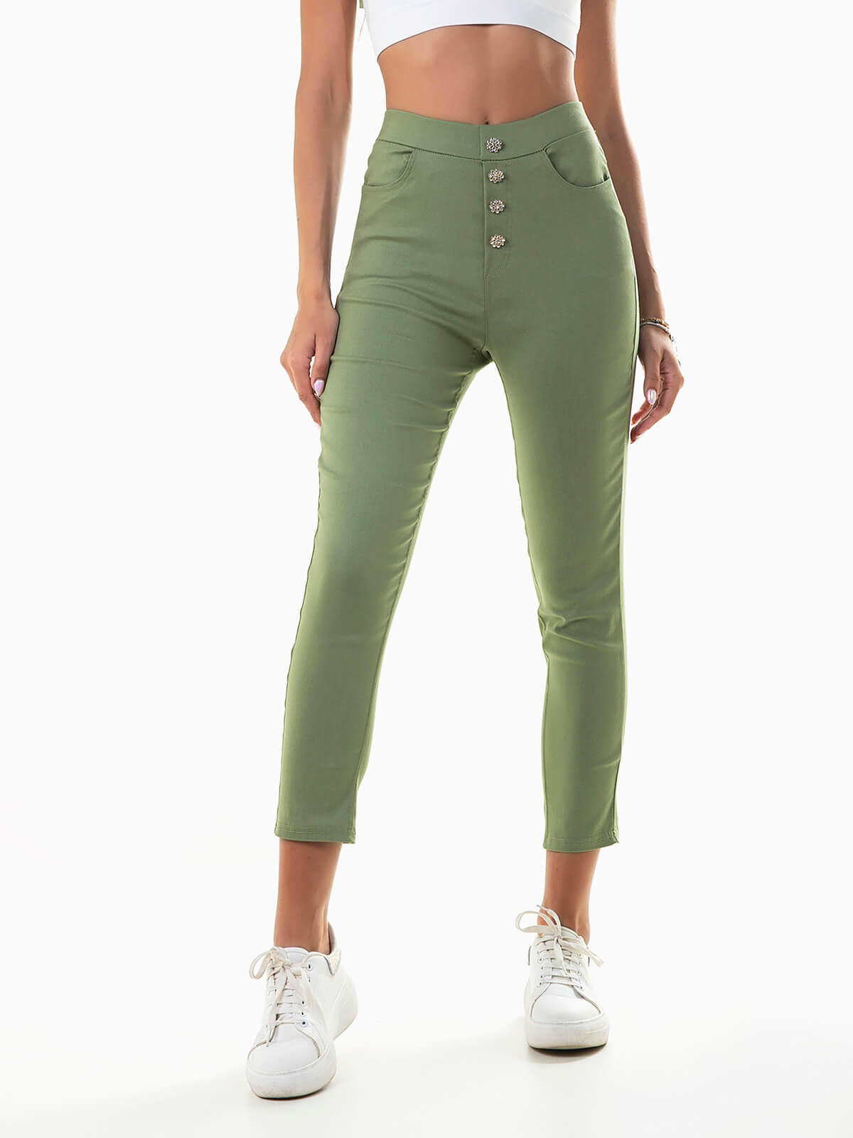 Leggings de cintura alta com botões de jóia decorativos. Leggings elásticos para senhora.