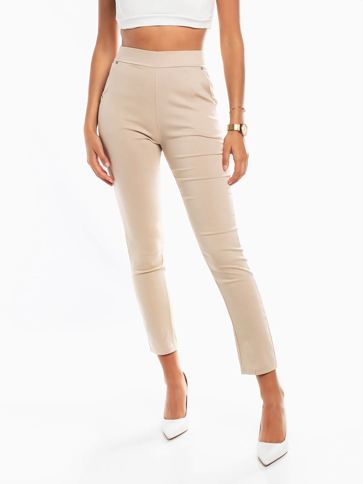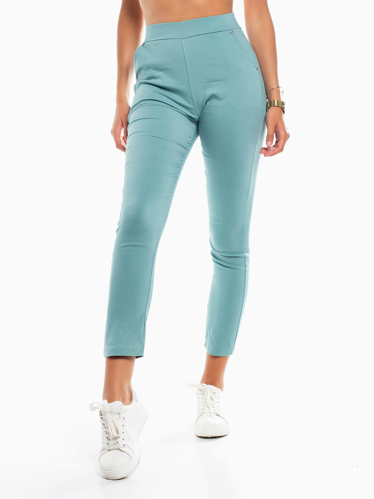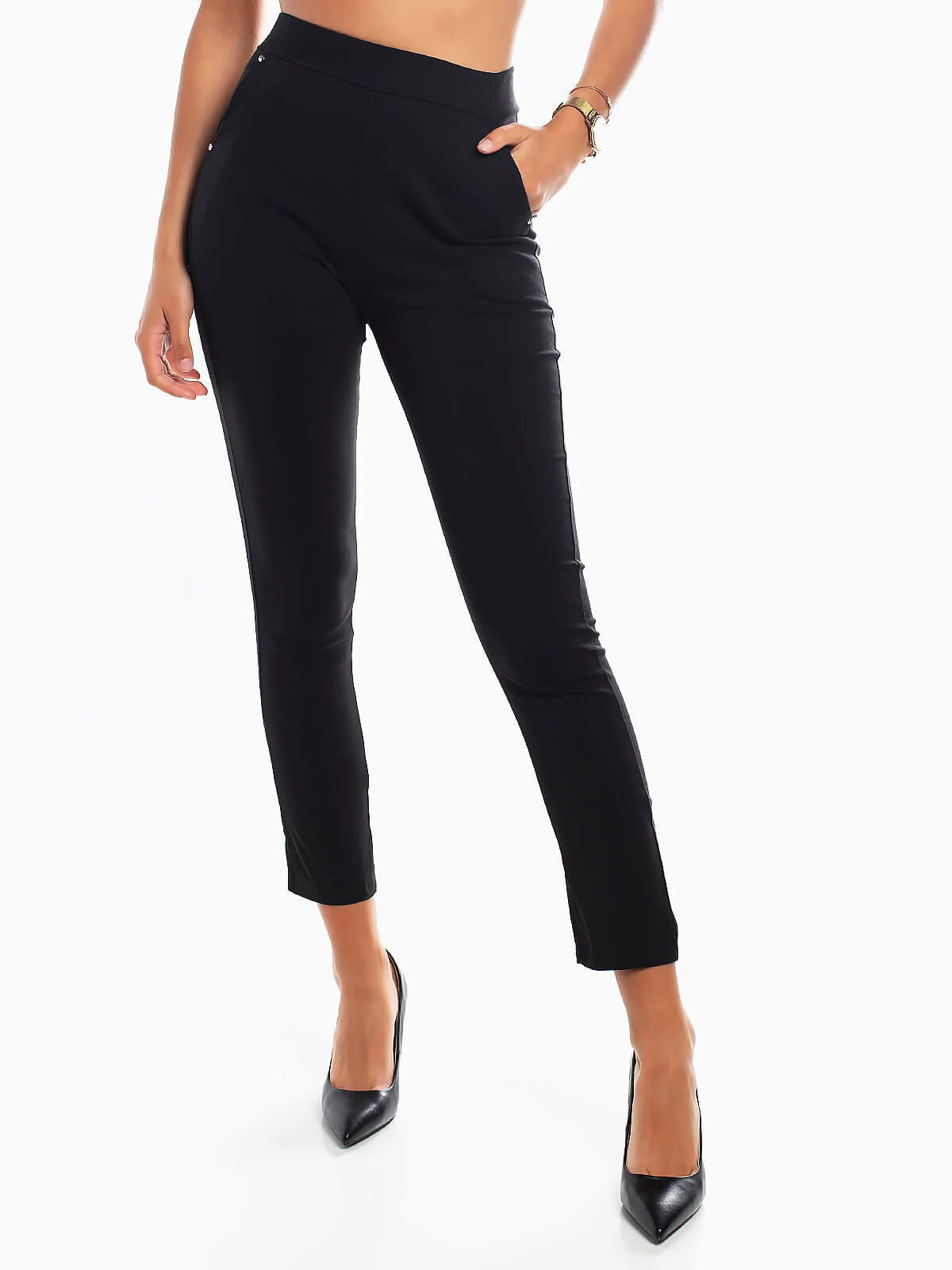 Leggings cintura alta elástica. Bolsos laterais com pormenores de pedras.