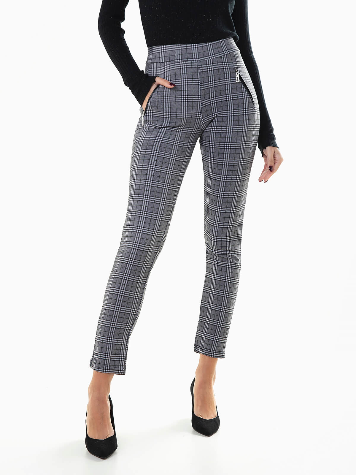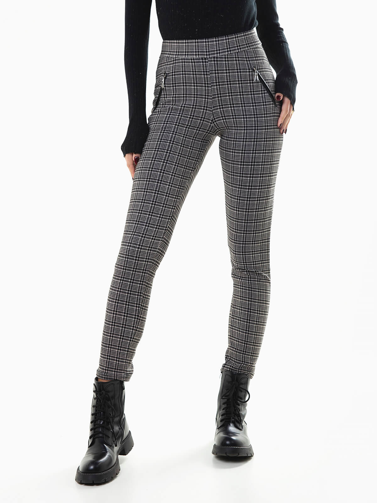 Leggings de cintura alta em xadrez para senhora. Leggings elásticas. 2 bolsos na parte posterior e 2 com zíper.