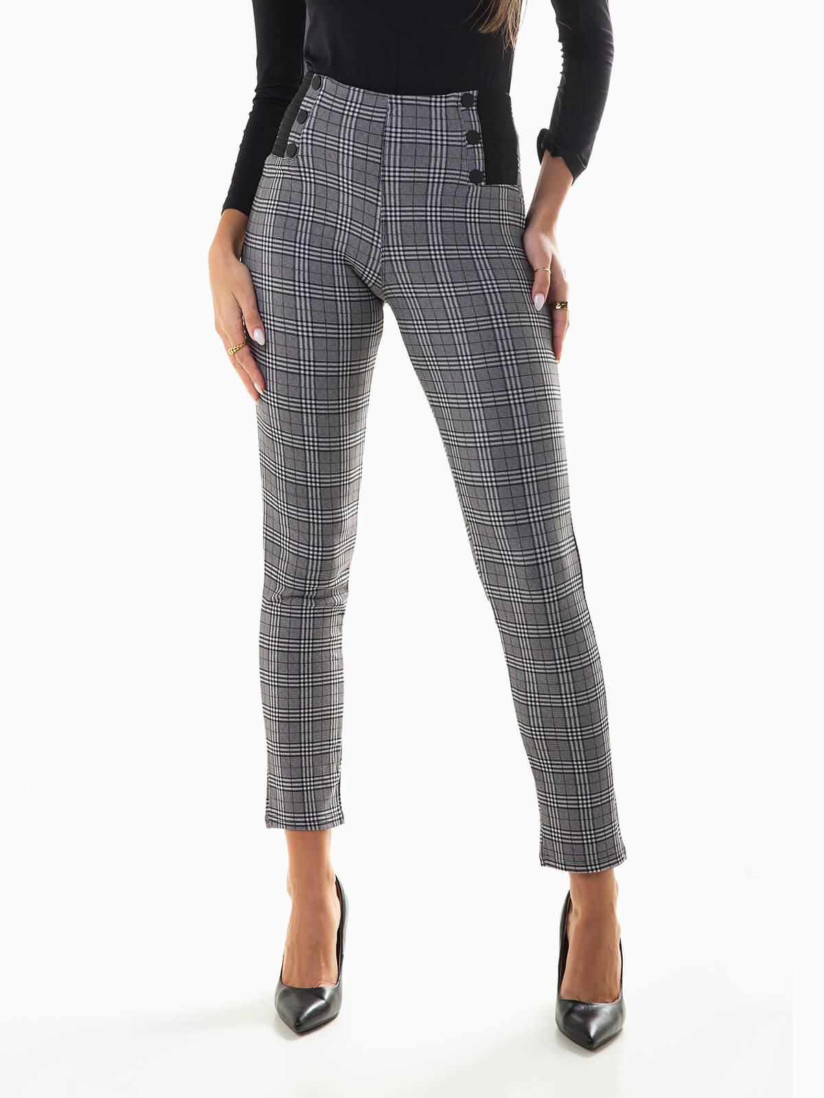 Leggings xadrez de cintura alta elástica para senhora. Leggings com 2 bolsos na parte posterior e botões decorativos à frente. Sem carda.