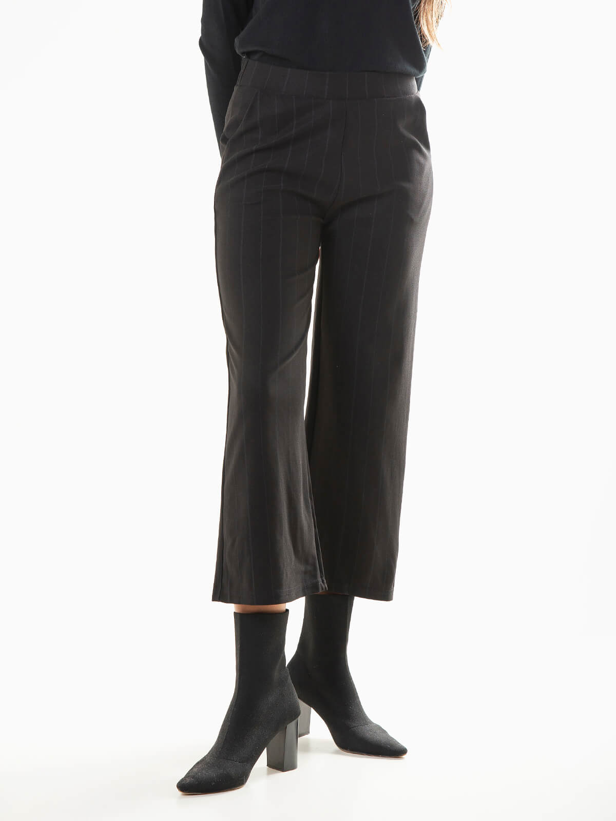 Leggings curtas pretas às riscas para senhora. Leggings largas com cintura alta elástica sem carda. 2 bolsos laterais. Práticas e confortáveis, são ideais para o dia a dia.