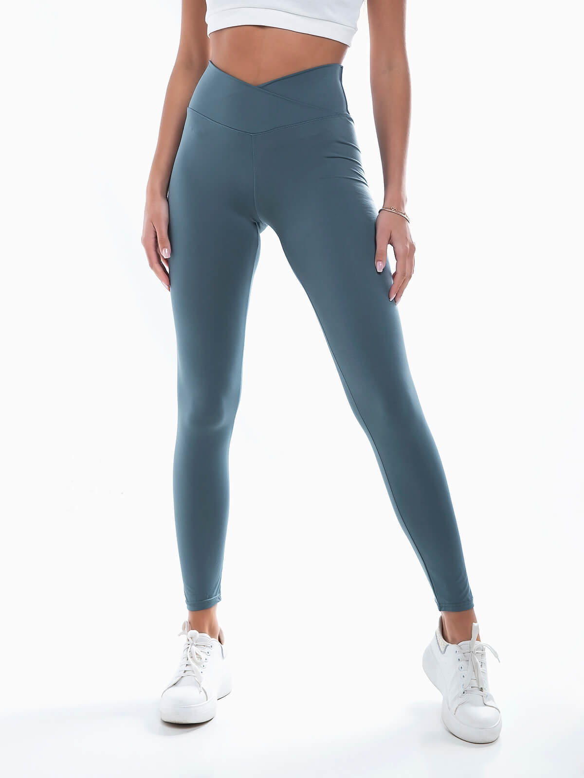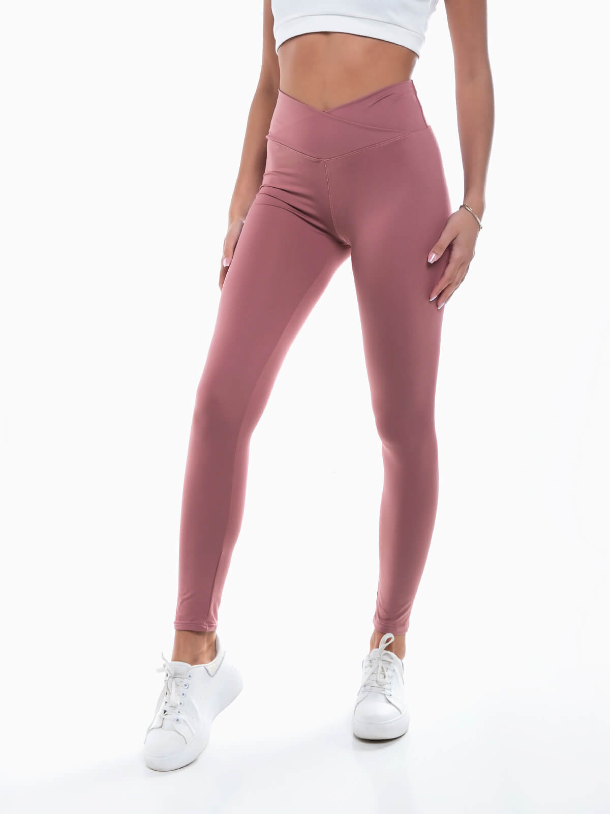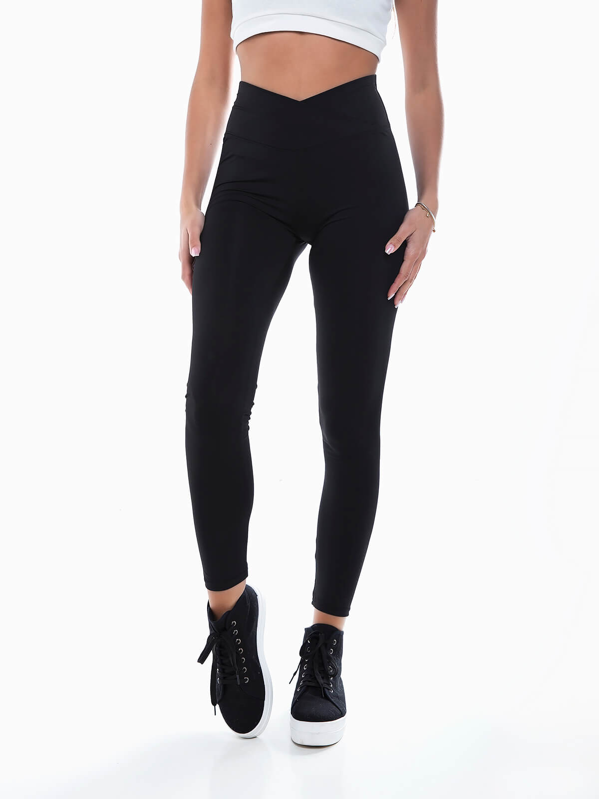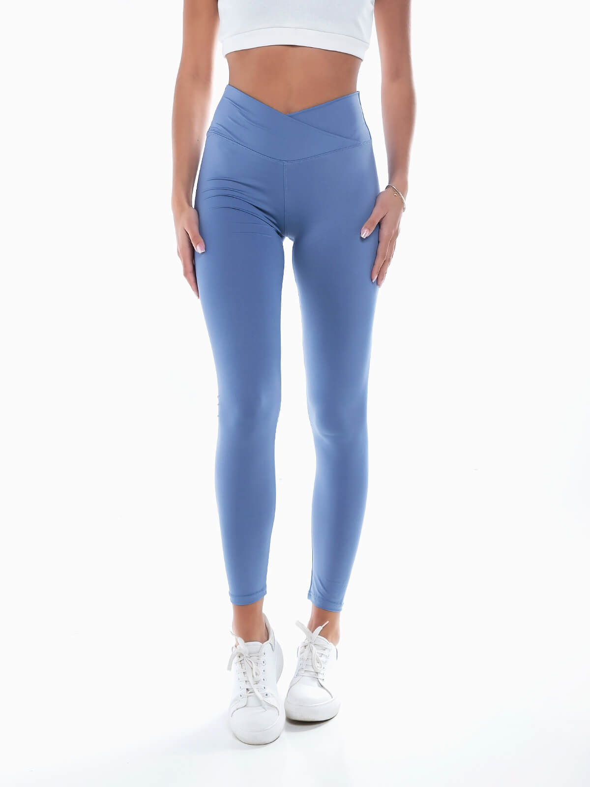 Leggings desportivas de cintura alta com pormenor de trespasse no cinto. Leggings elásticas e confortáveis.
