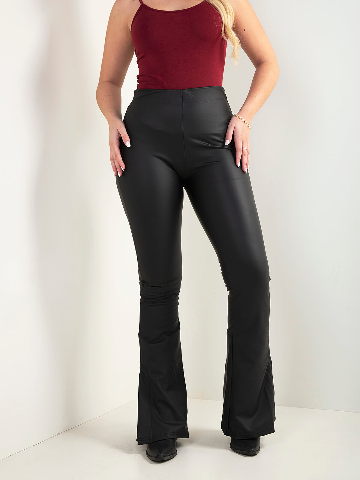 Leggings efeito pele à boca de sino, com cintura alta e interior suave ao toque. Ajustadas na perna e com abertura discreta no final, perfeitas para looks modernos e femininos. Ficam perfeitos com camisolas largas ou malhas justas e botins para alongar a silhueta.