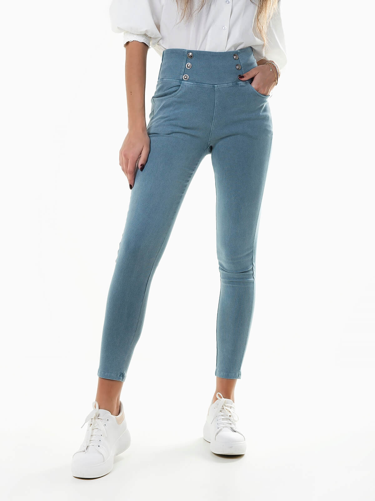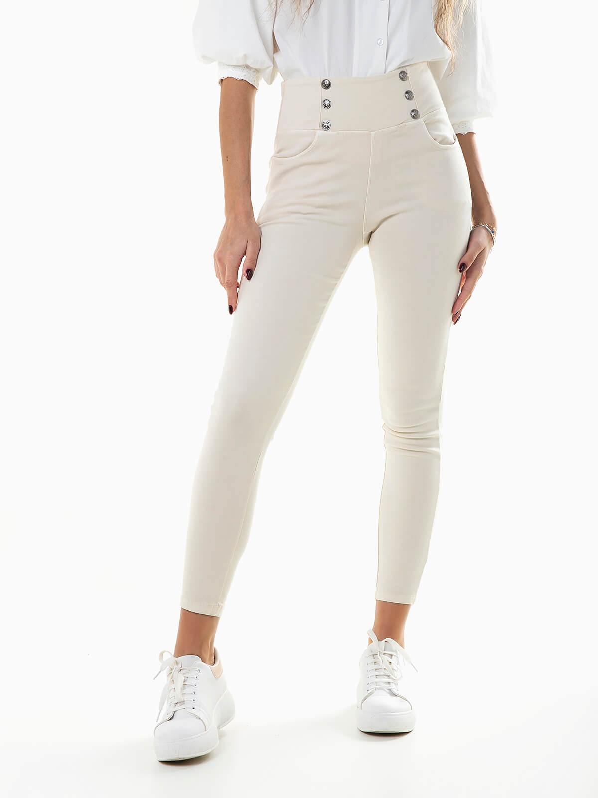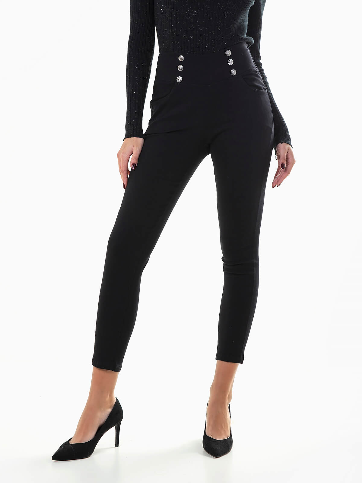 Leggings elásticas de cintura alta com botões prateados decorativos. Leggings para senhora com 4 bolsos.