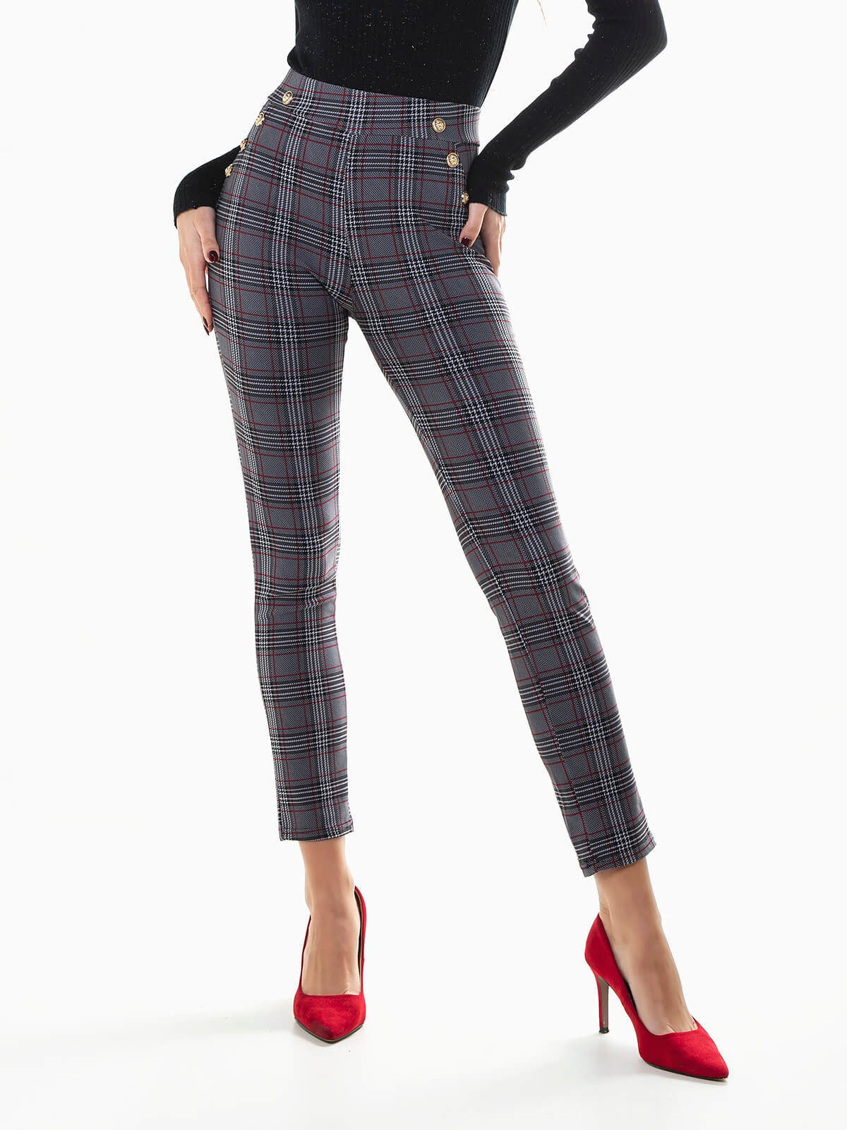 Leggings elásticas em xadrez tartan com botões dourados aplicados. Leggings de cintura alta com 2 bolsos na parte posterior.