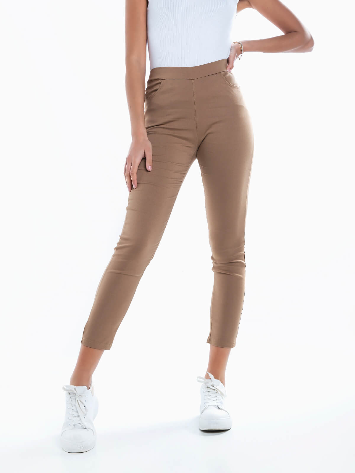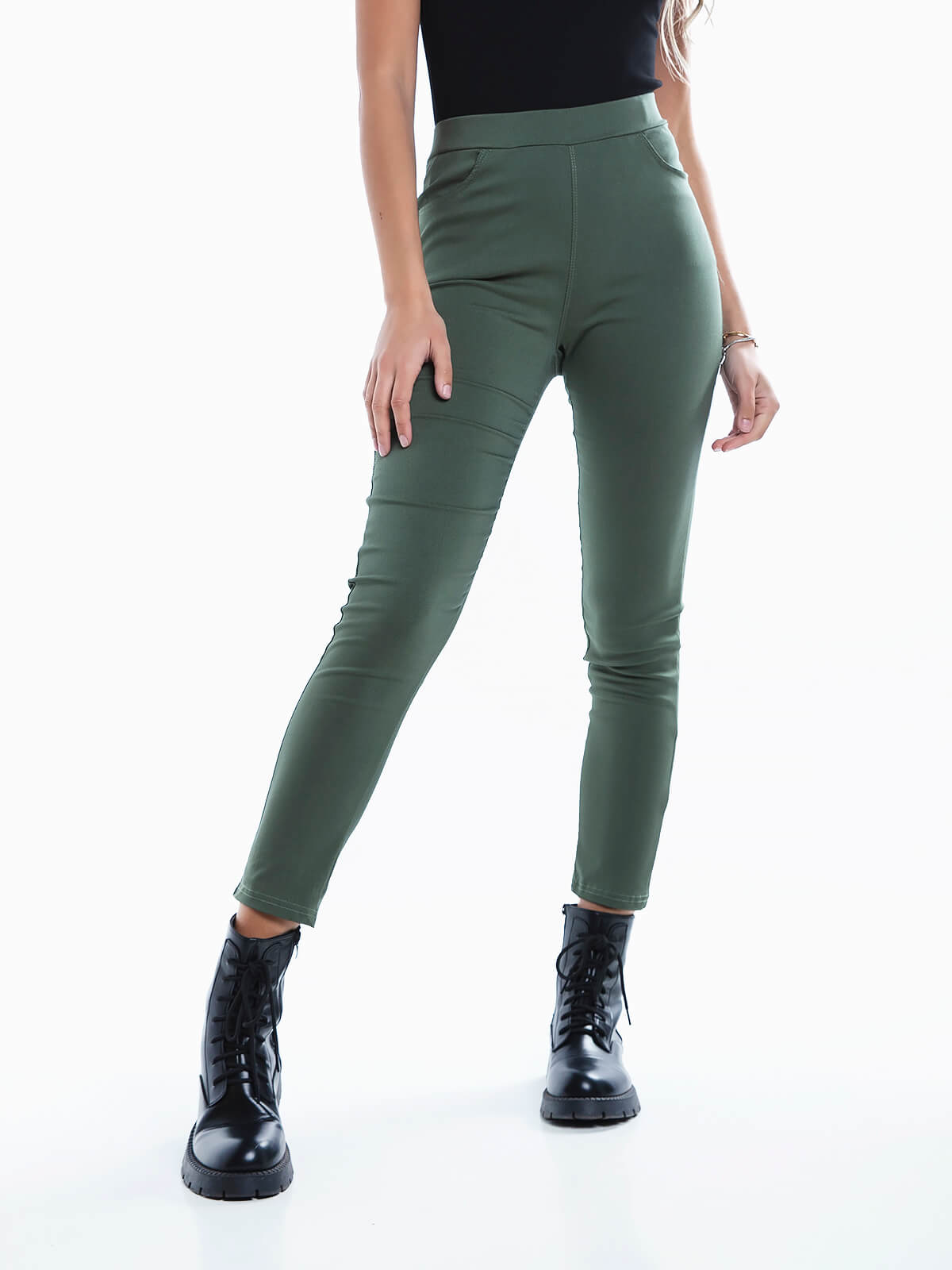 Leggings elásticos básicos para senhora. Leggings de cintura alta com bolsos cortados atrás para efeito. 2 bolsos na frente.