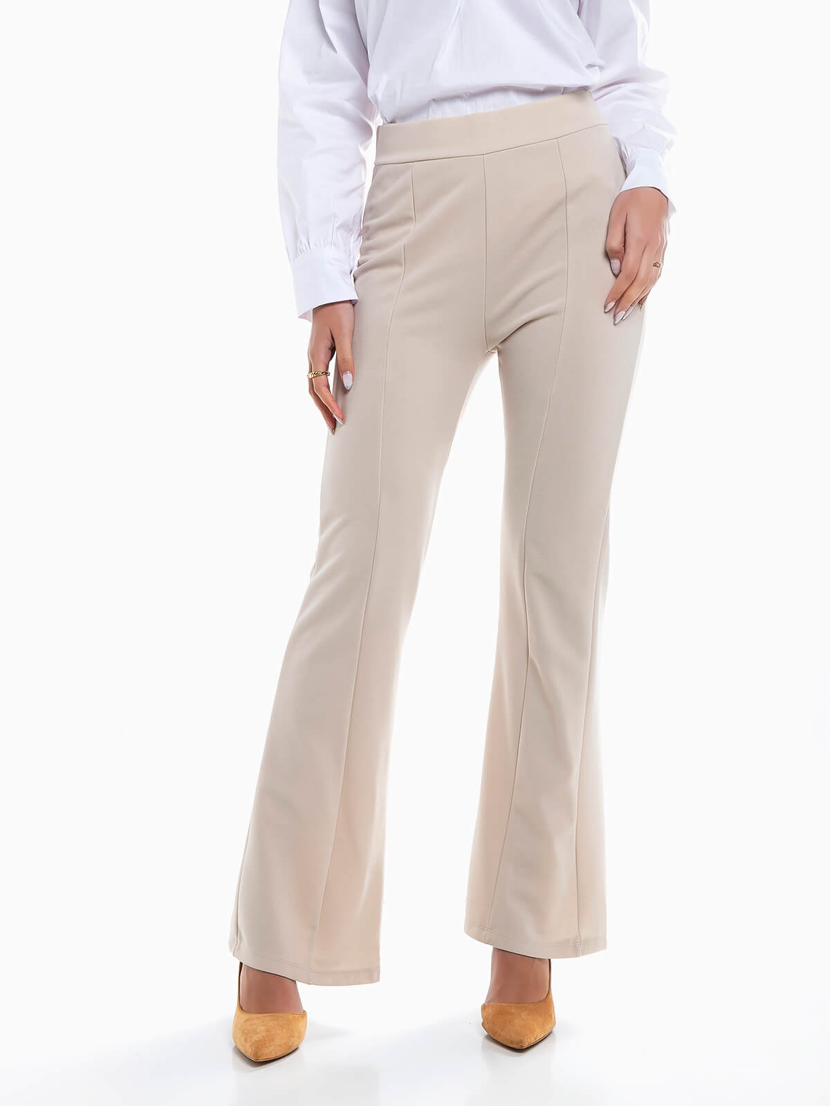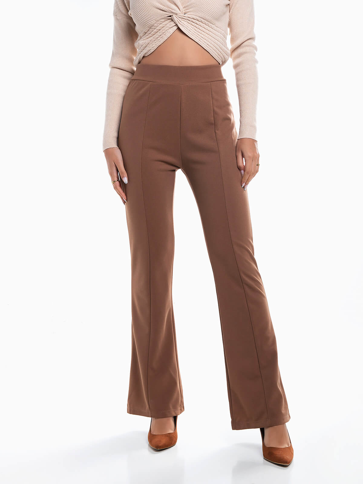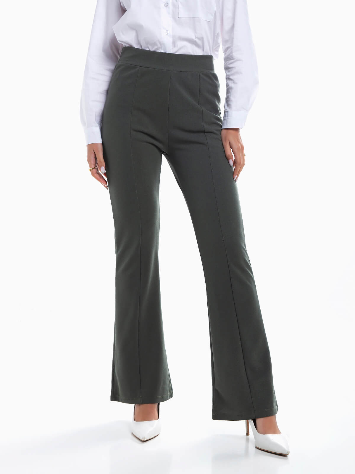 Leggings flare com pormenor pinças à frente. Leggings elásticas cintura alta para senhora.