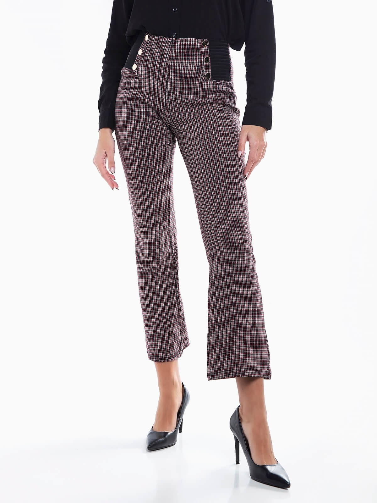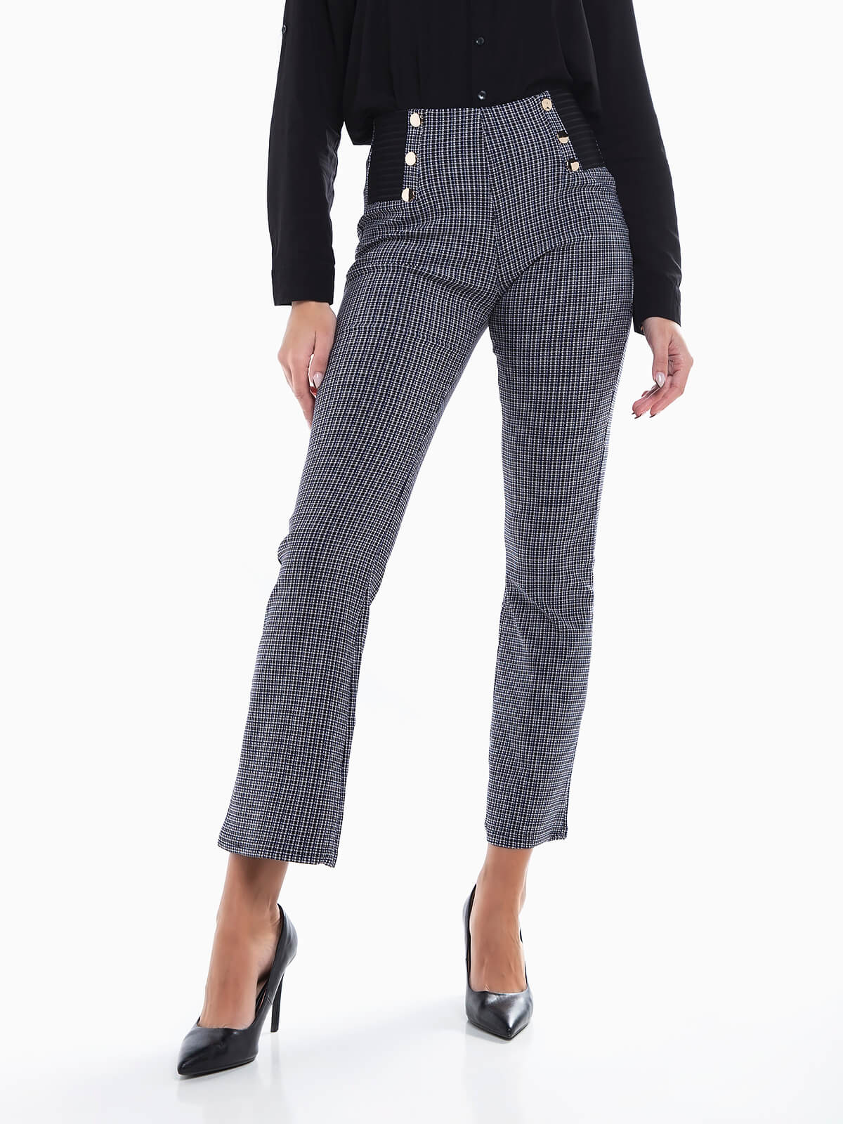 Leggings flare em xadrez com botões aplicados. Leggings elásticas de cintura alta.
