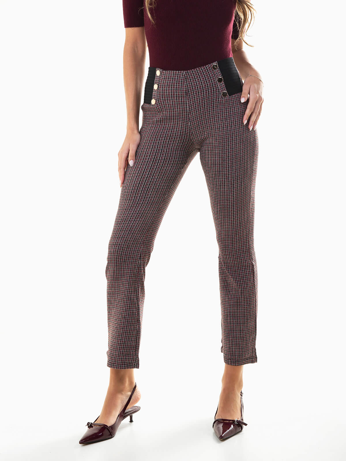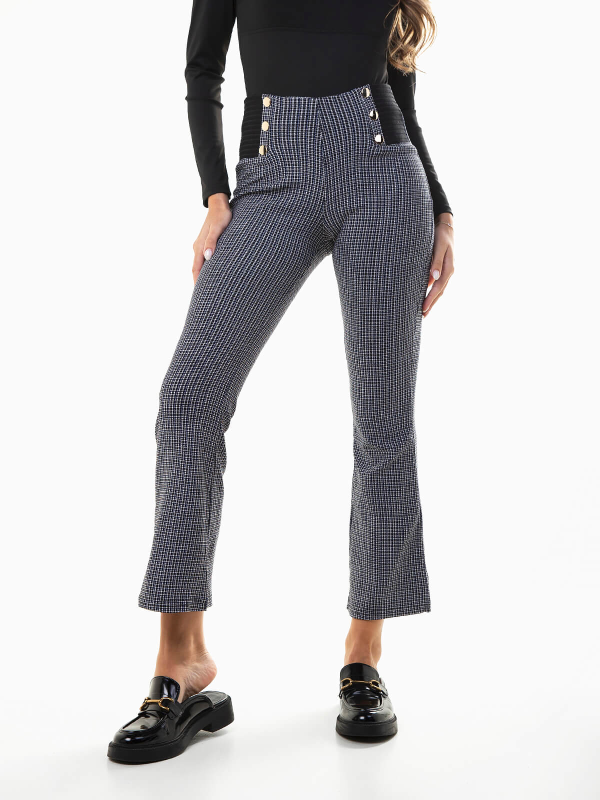 Leggings flare em xadrez com botões aplicados. Leggings elásticas de cintura alta.