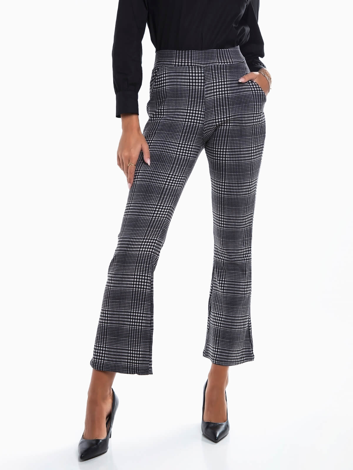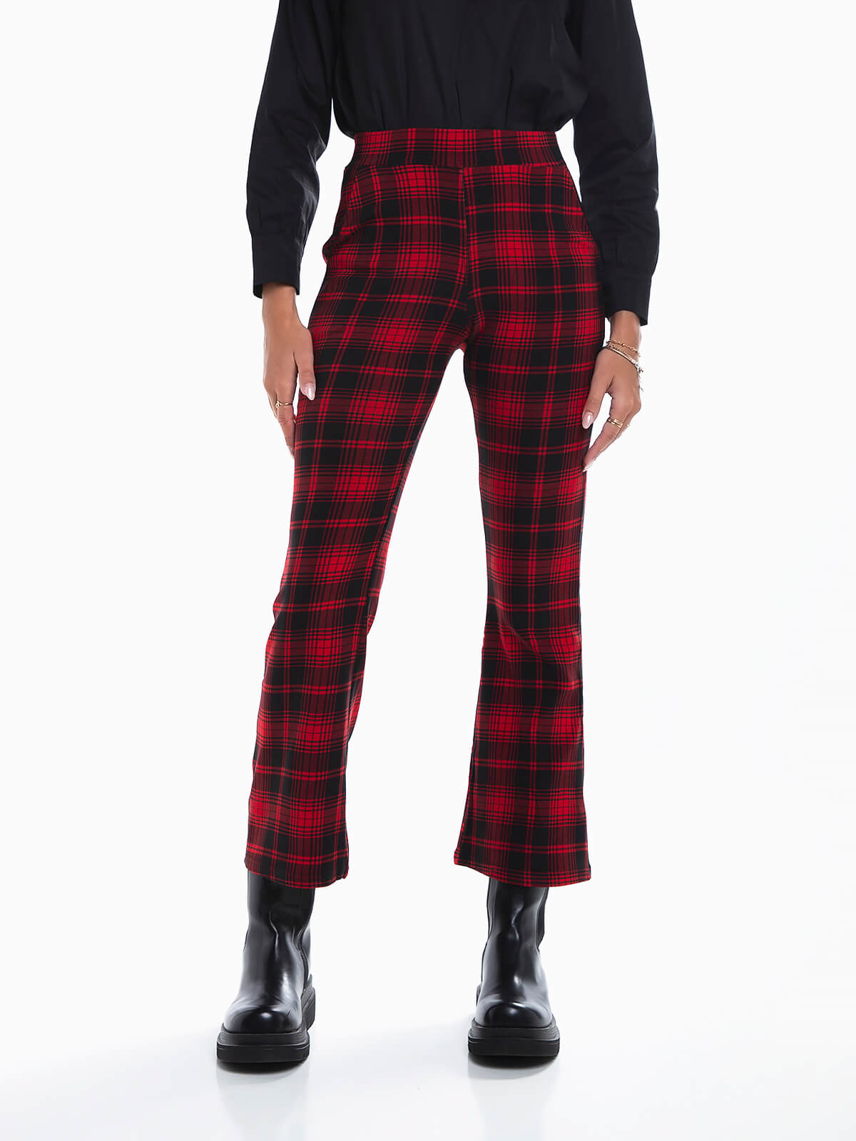 Leggings à boca de sino estampadas em xadrez tartan escocês para senhora. Leggings de cintura alta elástica com 2 bolsos.