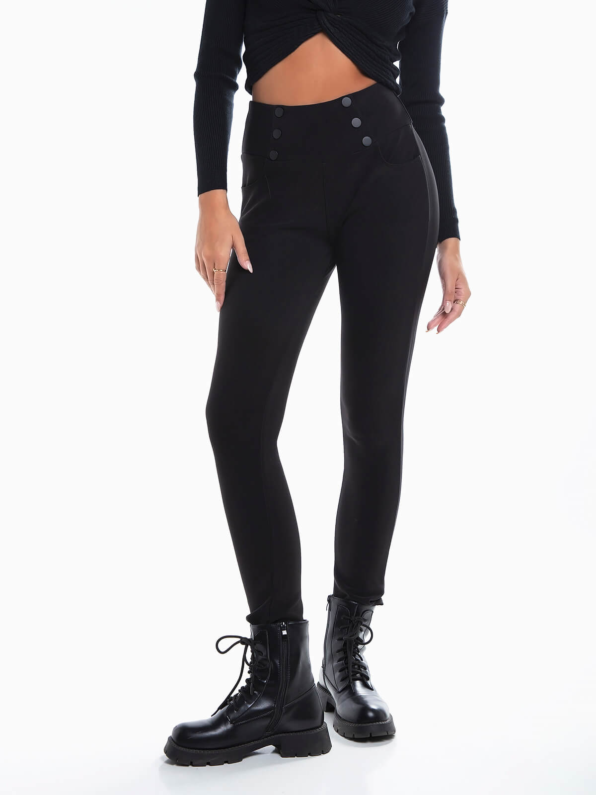 Leggings pretas com 2 bolsos à frente e botões decorativos. Leggings elásticas com cintura alta.